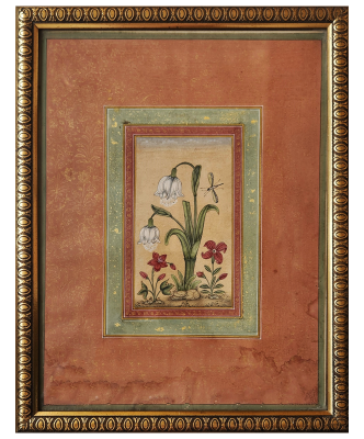 A delicate miniature painting depicting white bell flowers, red blossoms, and a dragonfly, framed in an ornate border.