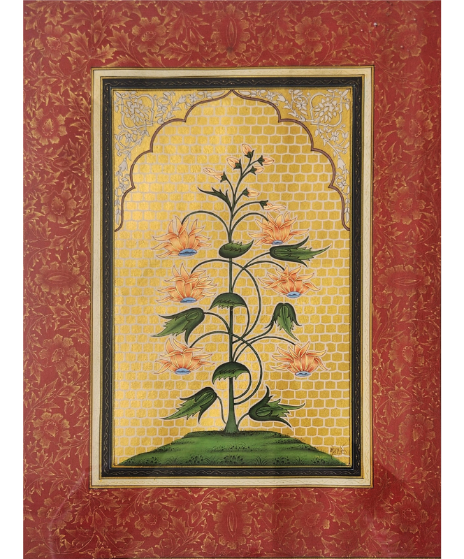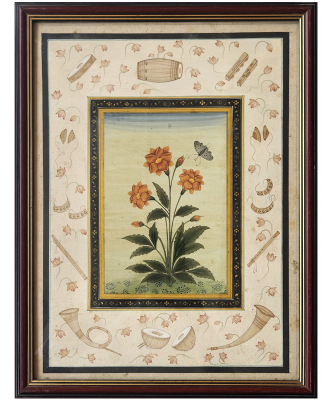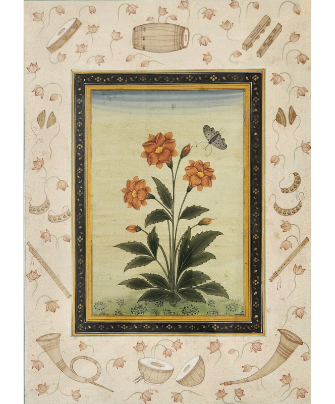 A delicate miniature painting featuring vibrant orange flowers and a butterfly, surrounded by traditional musical instruments and floral motifs.