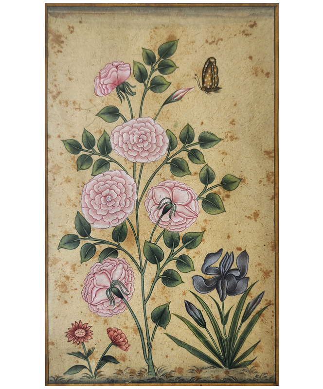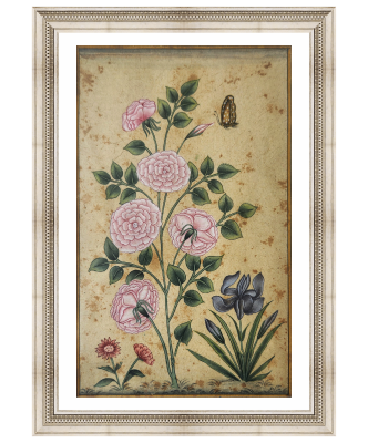 A delicate miniature painting depicting a vibrant arrangement of flowers and a butterfly.