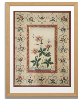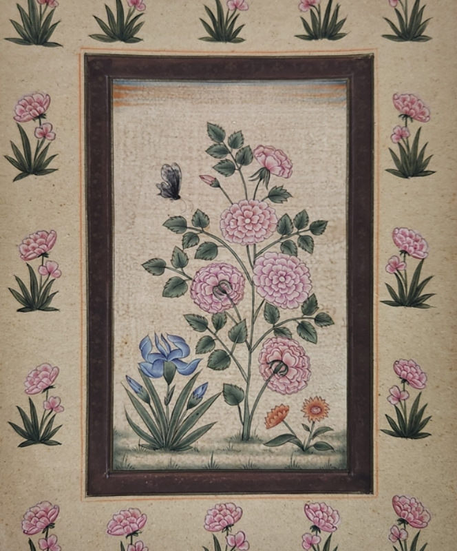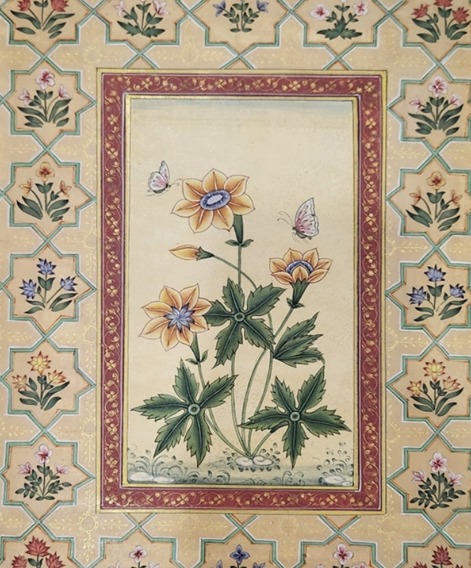 A delicate miniature painting depicting a blooming flower with a butterfly, surrounded by intricate floral patterns.
