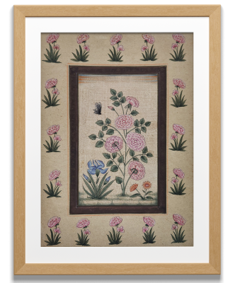 A delicate miniature painting showcasing vibrant flowers and butterflies, framed by an intricate floral border.