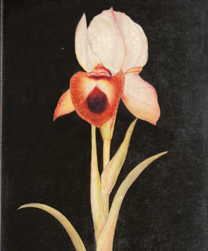 A detailed oil painting of a single orchid flower against a dark background.