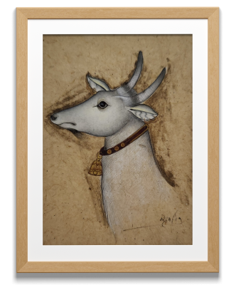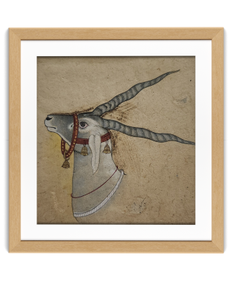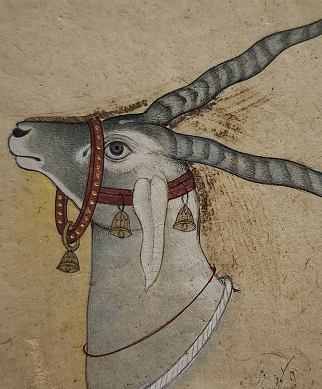 This exquisite miniature painting depicts the head of an antelope adorned with intricate jewelry.