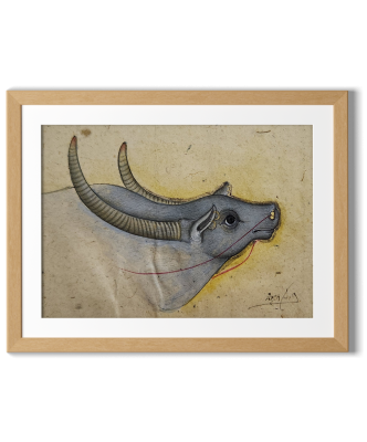 This miniature painting captures the serene and majestic profile of a water buffalo.