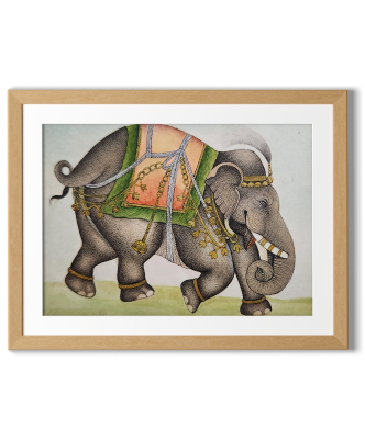 This traditional Indian miniature painting depicts a richly adorned elephant in profile, walking gracefully as part of a ceremonial procession.