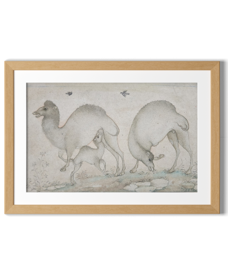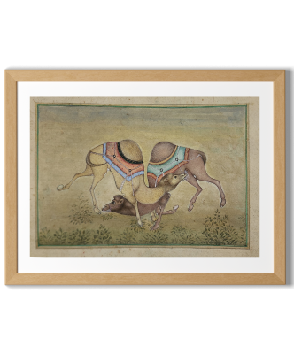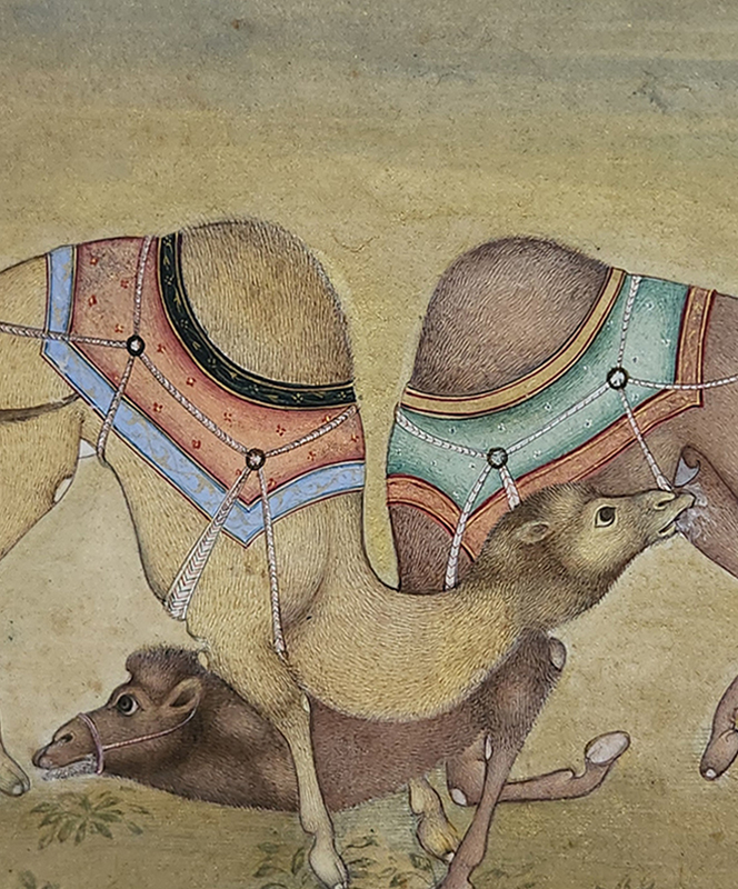 This beautiful miniature painting captures two camels in a serene moment amidst nature.