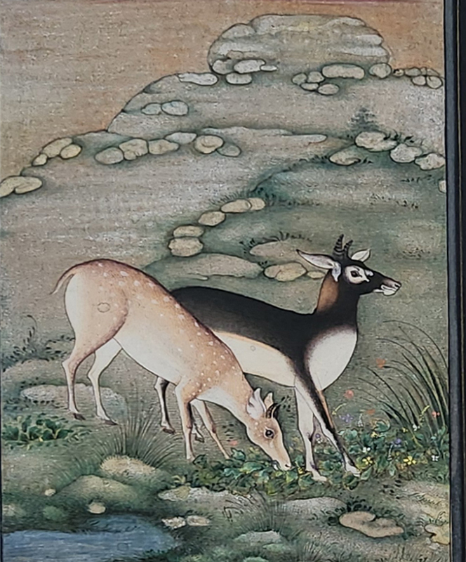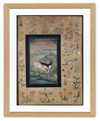 A Mughal miniature painting depicting a serene scene with deer amidst a lush landscape, surrounded by intricate floral and avian motifs