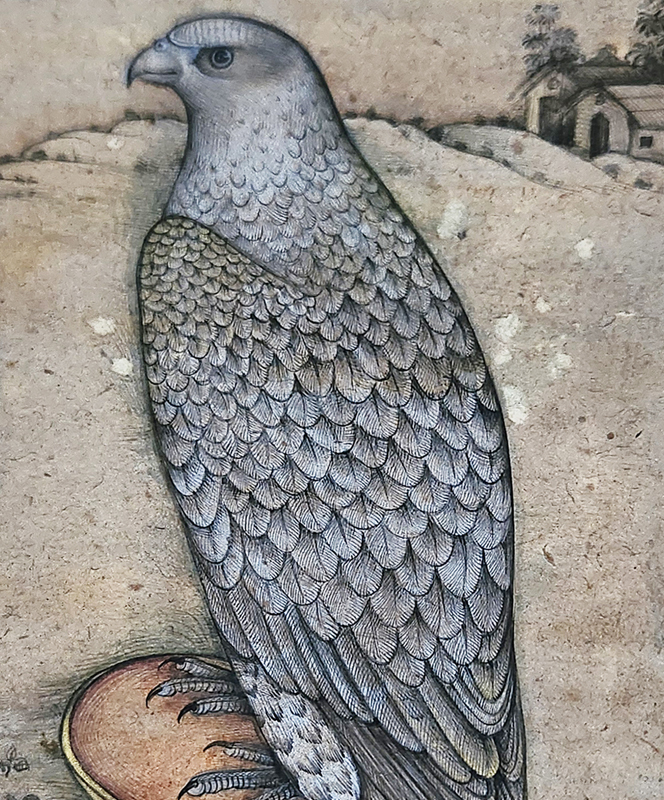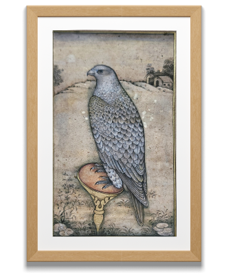 This elegant miniature painting, captures the regal beauty of a falcon perched gracefully on a stand.