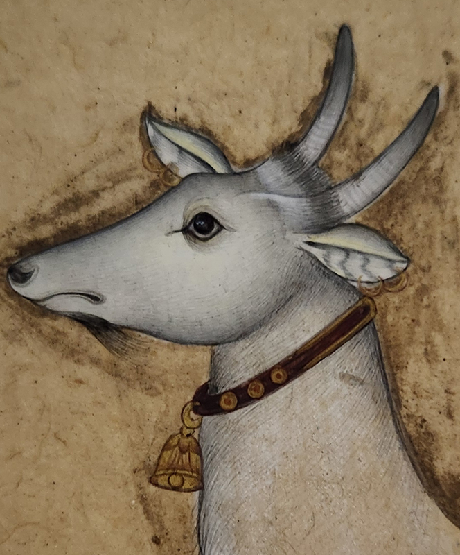 This exquisite miniature painting depicts the side profile of a bull, adorned with a decorative collar featuring a bell.