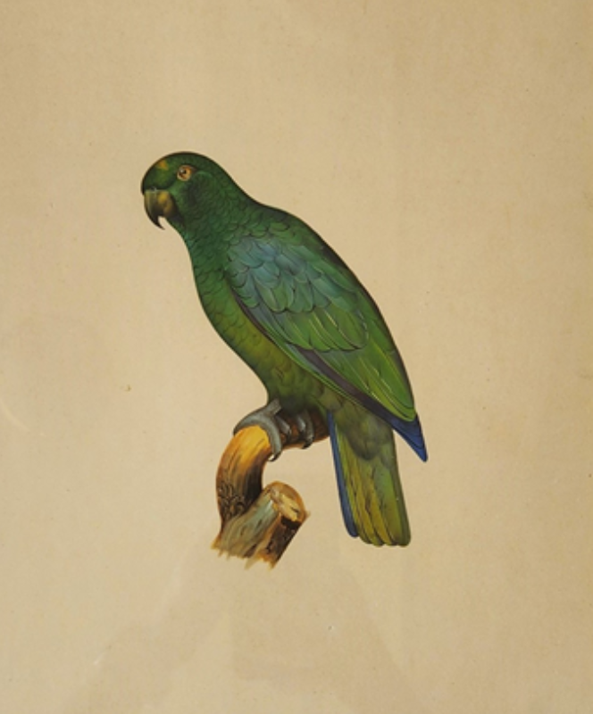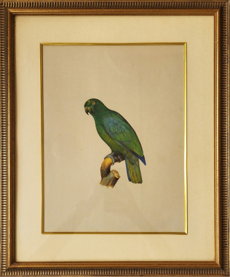 A vibrant miniature painting of a green parrot perched on a branch, framed in an elegant gold frame.