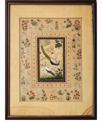 A detailed miniature painting depicting two peacocks amidst a lush garden, surrounded by intricate floral and avian motifs.