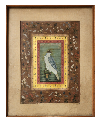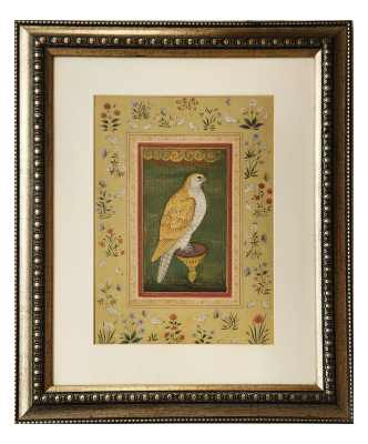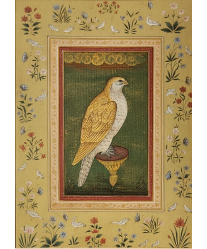 A detailed miniature painting of a falcon perched on a stand, surrounded by intricate floral and avian motifs.