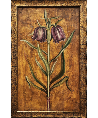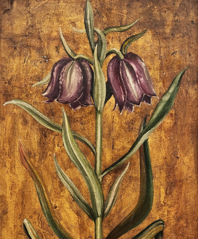 A detailed oil painting of a bellflower plant with two purple blossoms against a textured golden background.