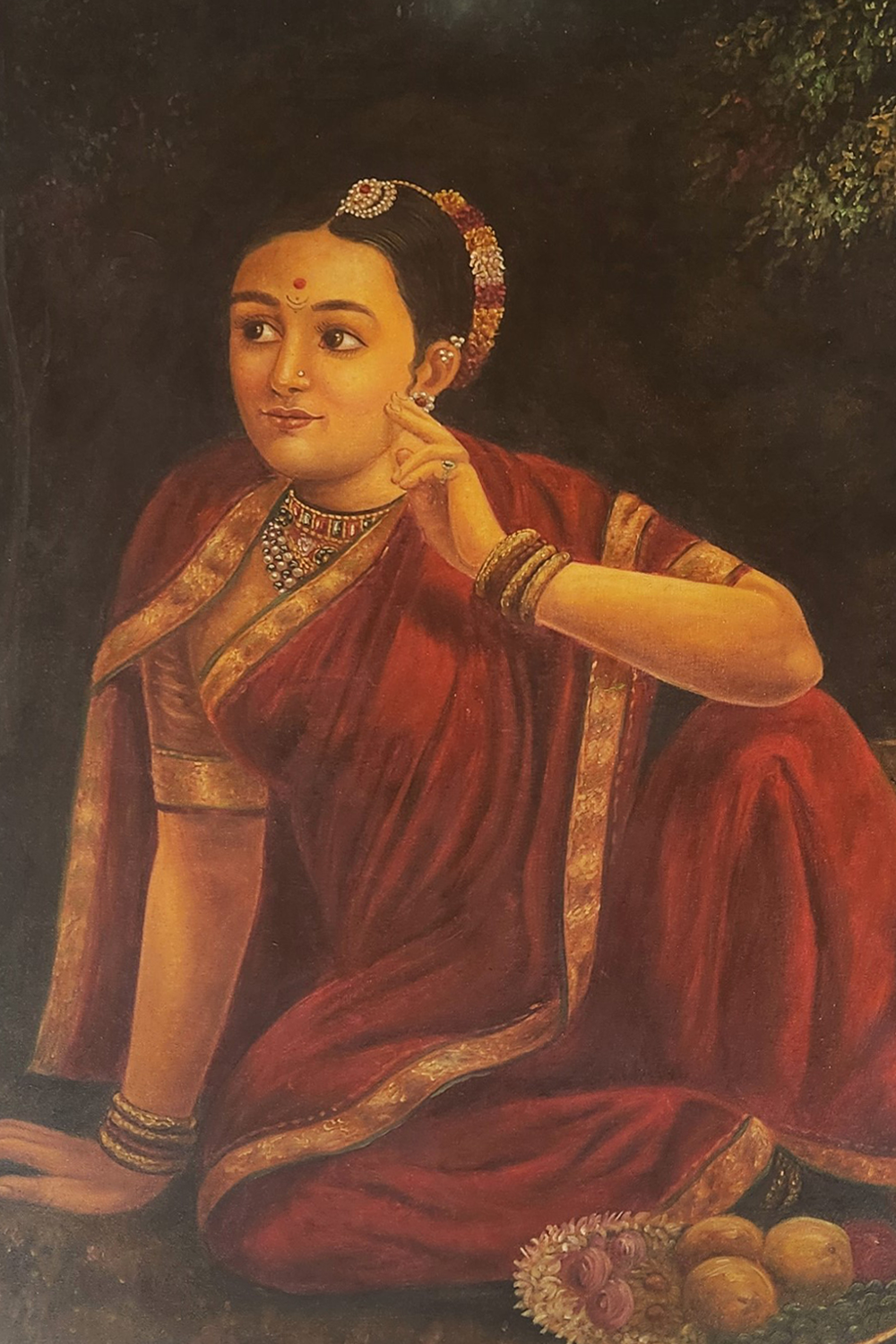 A captivating oil painting of a lady seated gracefully, adorned in a saree and traditional jewellery, exuding timeless beauty.