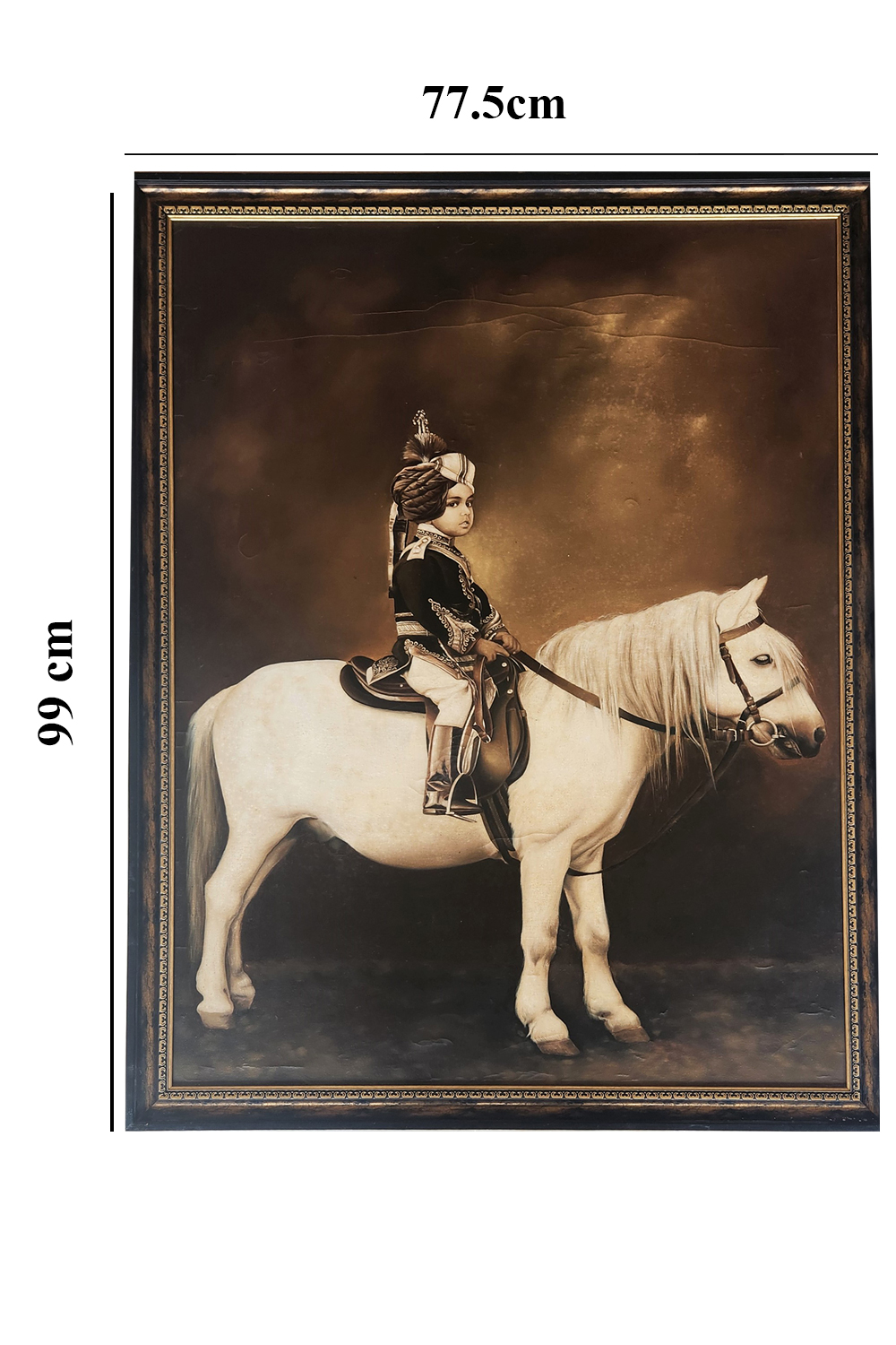This oil painting depicts a regal scene of a king's son sitting gracefully on a horse, radiating power and nobility. The intricate details bring out the elegance of royal heritage, with bold strokes that highlight the grandeur of both the rider and his steed. A perfect piece to add sophistication and timeless charm to your collection.