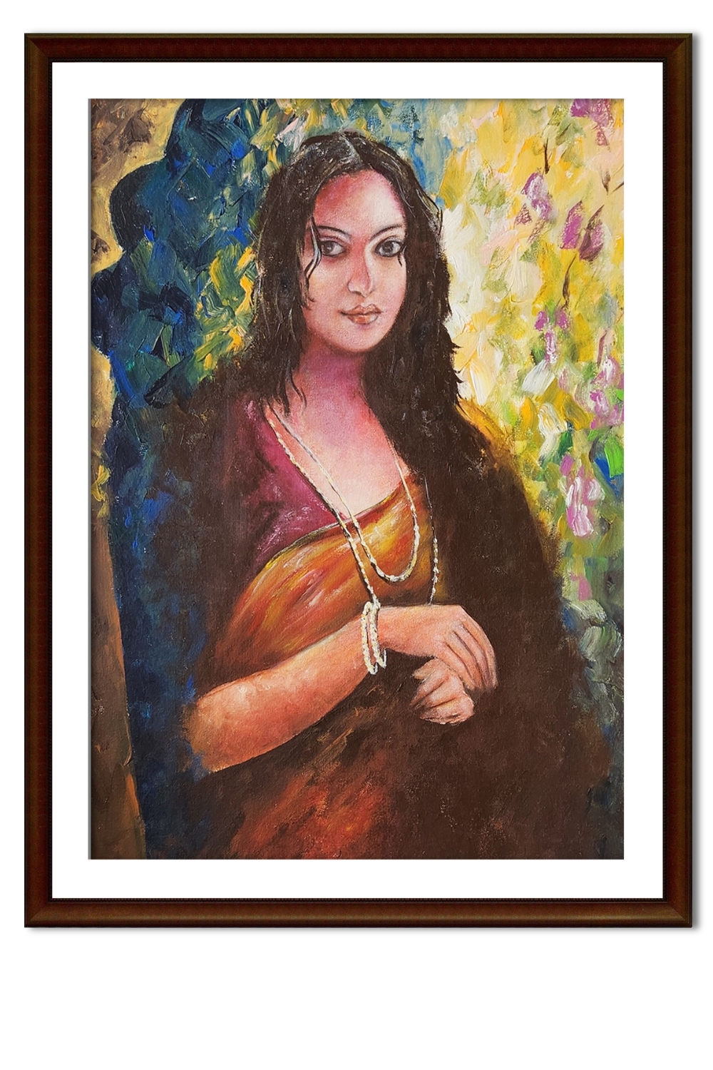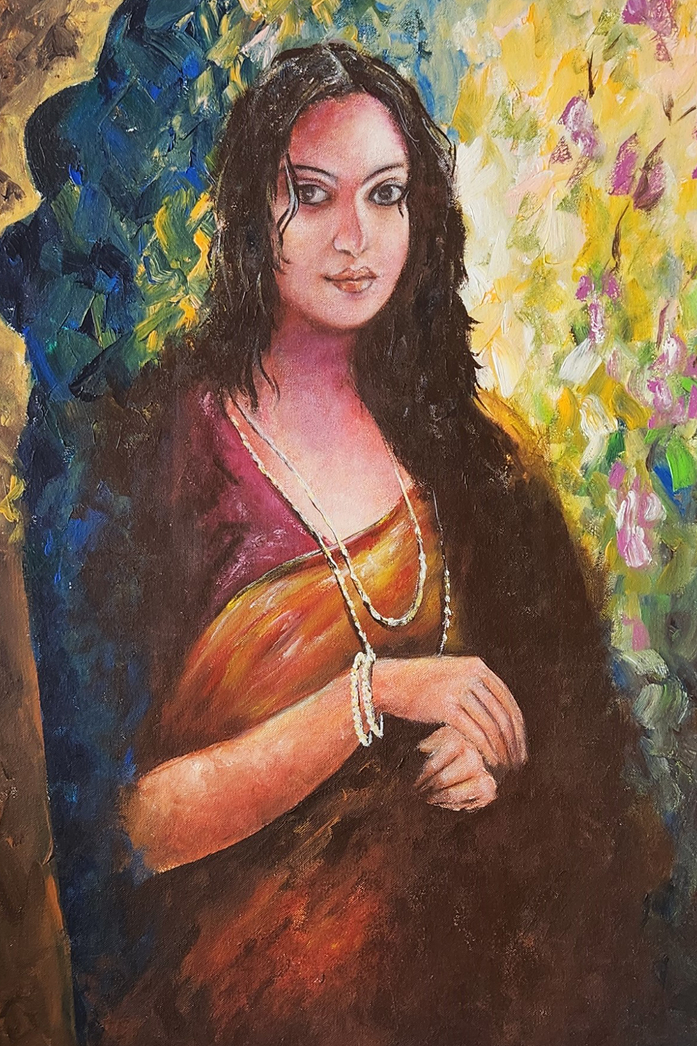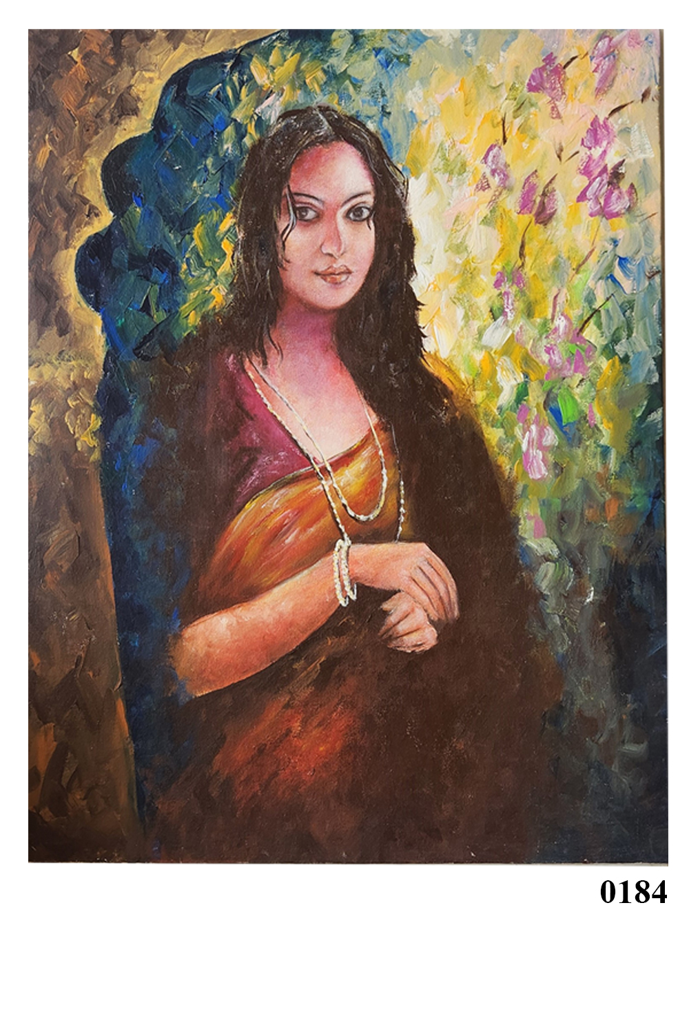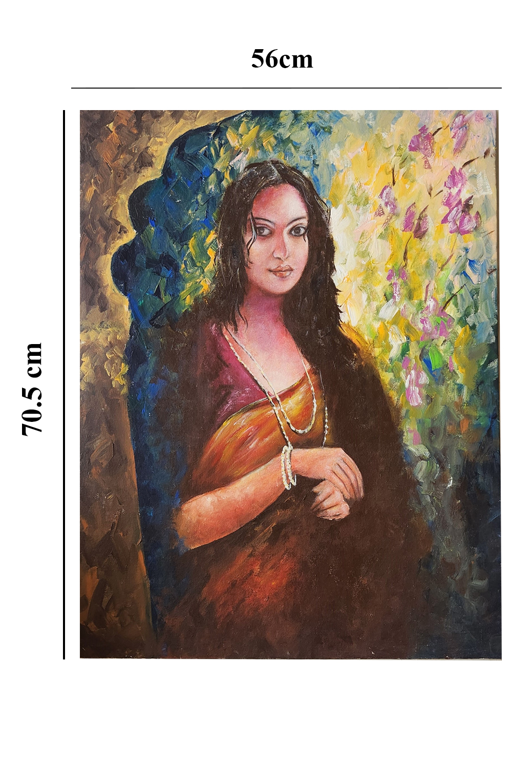 This stunning oil painting of a lady captures timeless beauty, with soft hues and delicate details that bring the figure to life. The artist's careful attention to form and light creates a striking image, perfect for enhancing any space. The artwork is meticulously crafted on a high-quality canvas to ensure lasting vibrancy.12% GST is applied additionally. Handle the painting with care, avoiding direct sunlight and moisture to preserve its elegance.