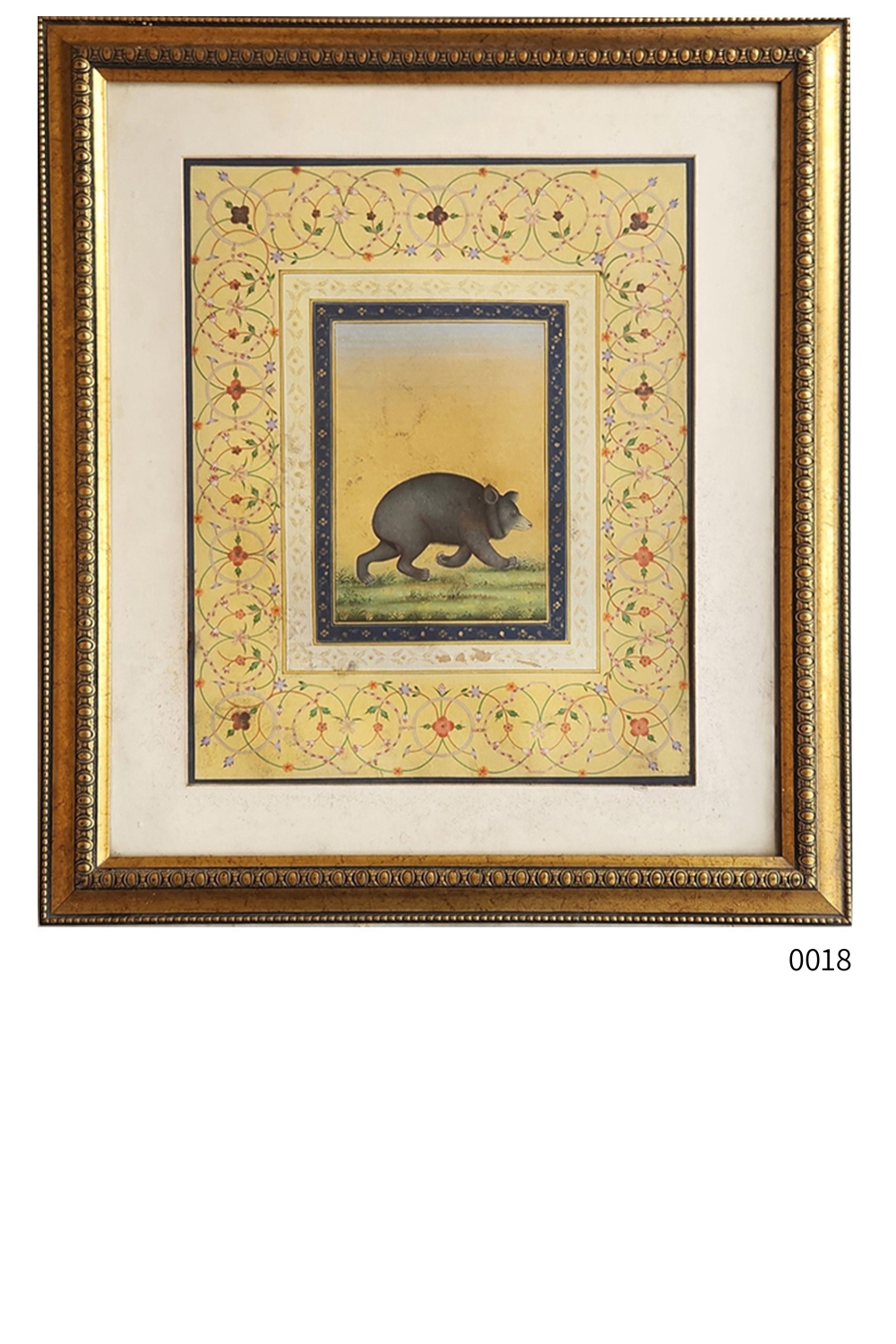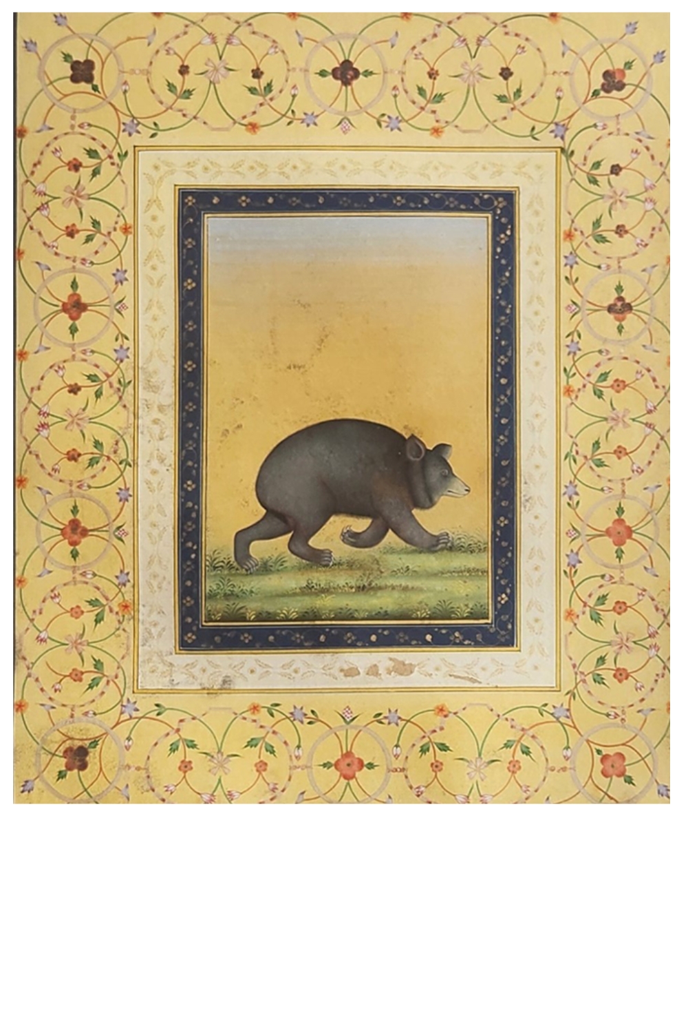 This exquisite miniature painting showcases a bear walking on a grassy patch against a yellow background. The painting is framed by a series of ornate borders featuring intricate floral and geometric patterns. Key features include: