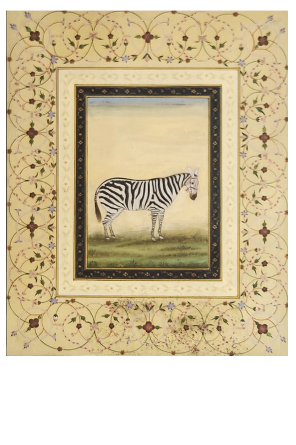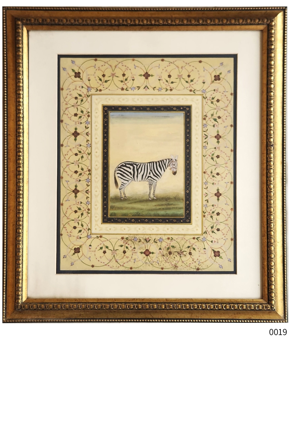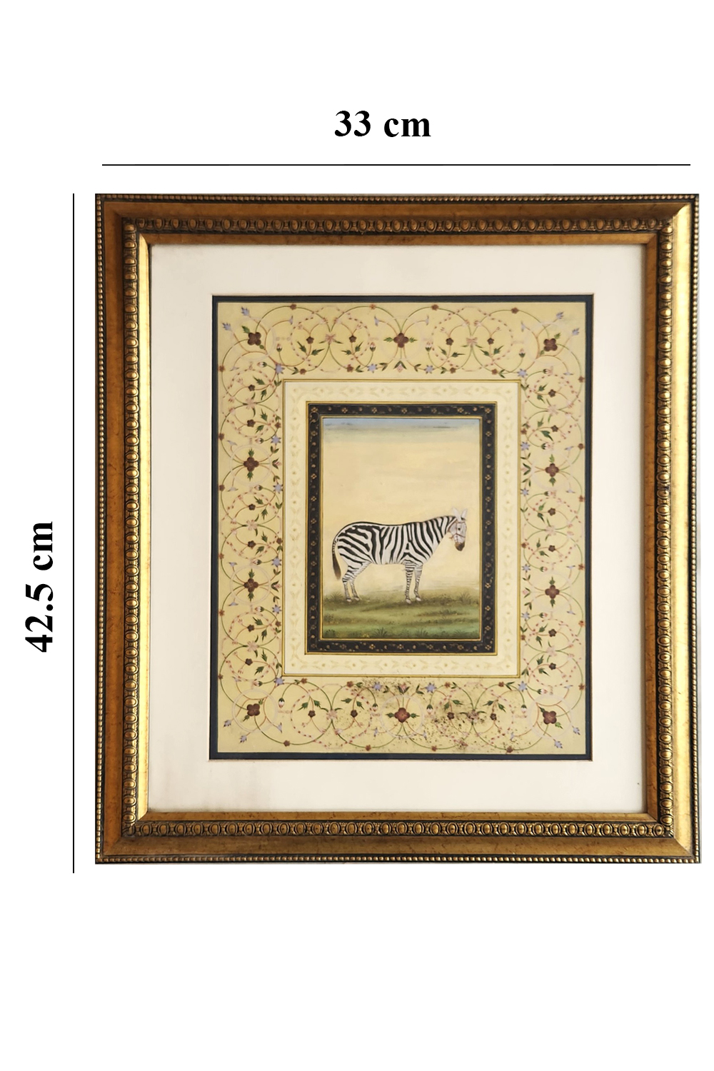 This miniature painting captures the serene image of a zebra standing peacefully on a grassy plain, set against a soft, muted background. The central figure of the zebra is encircled by an elaborate border featuring detailed floral and vine motifs, which adds elegance and complexity to the artwork. The entire piece is framed in a golden, ornate design that enhances its aesthetic appeal. Key features include: