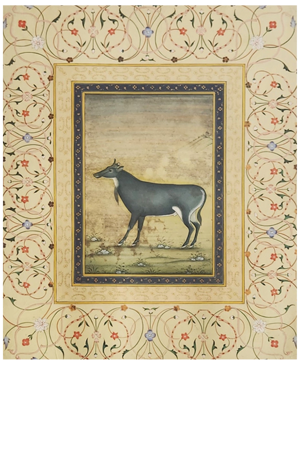 This exquisite Mughal miniature painting features a Nilgai, an Indian antelope, standing gracefully in a serene landscape. The painting is surrounded by an ornate border with intricate floral and vine patterns, characteristic of Mughal art. The Nilgai is depicted with a realistic yet stylized approach, showcasing the artist's attention to detail. The background is subtly textured, providing depth and context without overwhelming the central figure. The use of muted colors and fine brushwork highlights the elegance and sophistication of the Mughal artistic tradition.