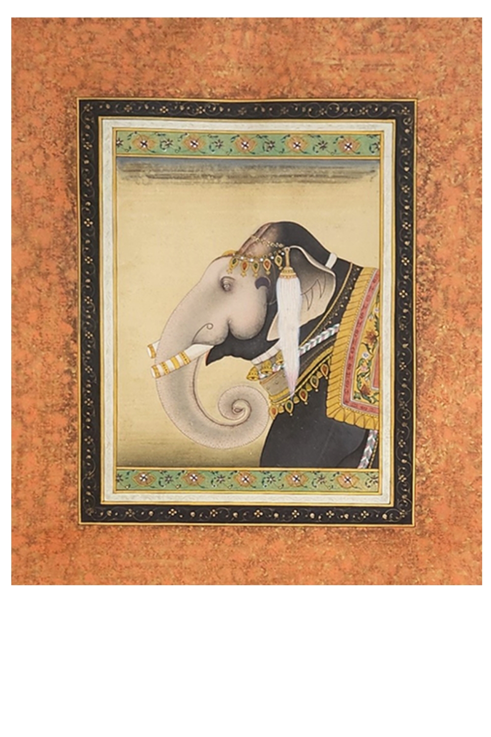 This exquisite miniature painting captures the grandeur of a regal elephant adorned with intricate ornaments and a richly decorated saddle cloth, set against an ornate background. The painting is framed with detailed floral borders, enhancing its elegance and traditional appeal. Key features include: