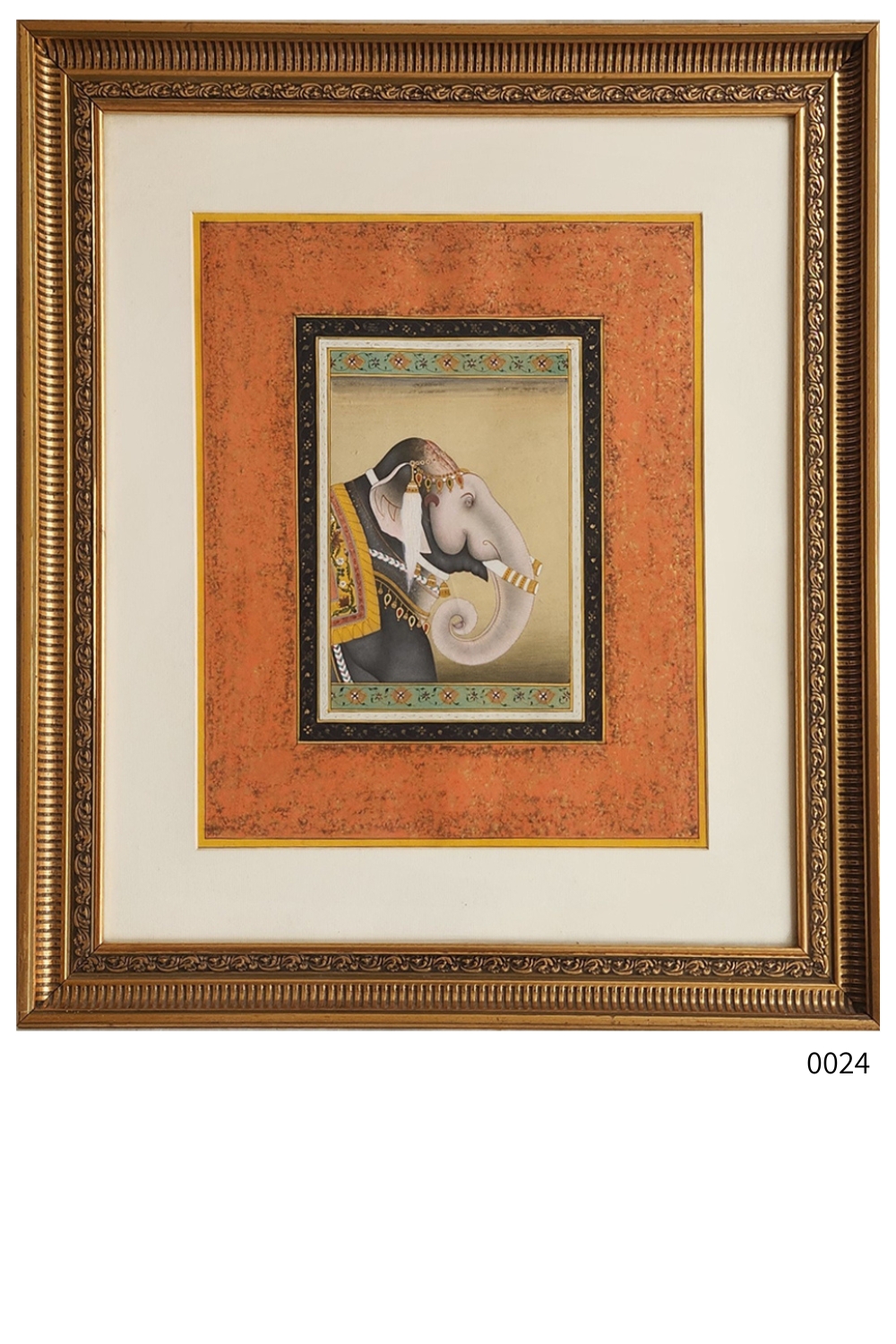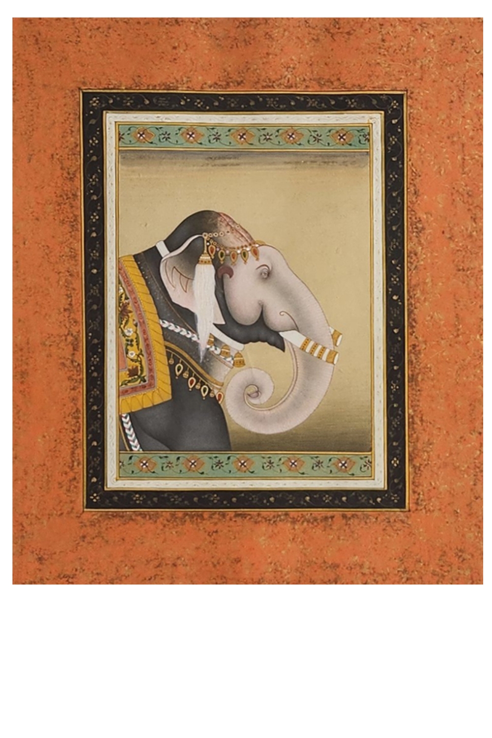 This exquisite miniature painting depicts a majestic elephant, richly adorned with traditional jewelry and a decorative headpiece. The elephant is shown in profile, highlighting its intricate adornments and the artist's attention to detail. The painting is set against a muted background, allowing the vibrant colors and patterns of the elephant's attire to stand out. The artwork is framed with a double border, featuring an inner frame with floral motifs and an outer frame with a textured orange pattern. The entire piece is encased in an ornate golden frame, adding to its regal appearance.