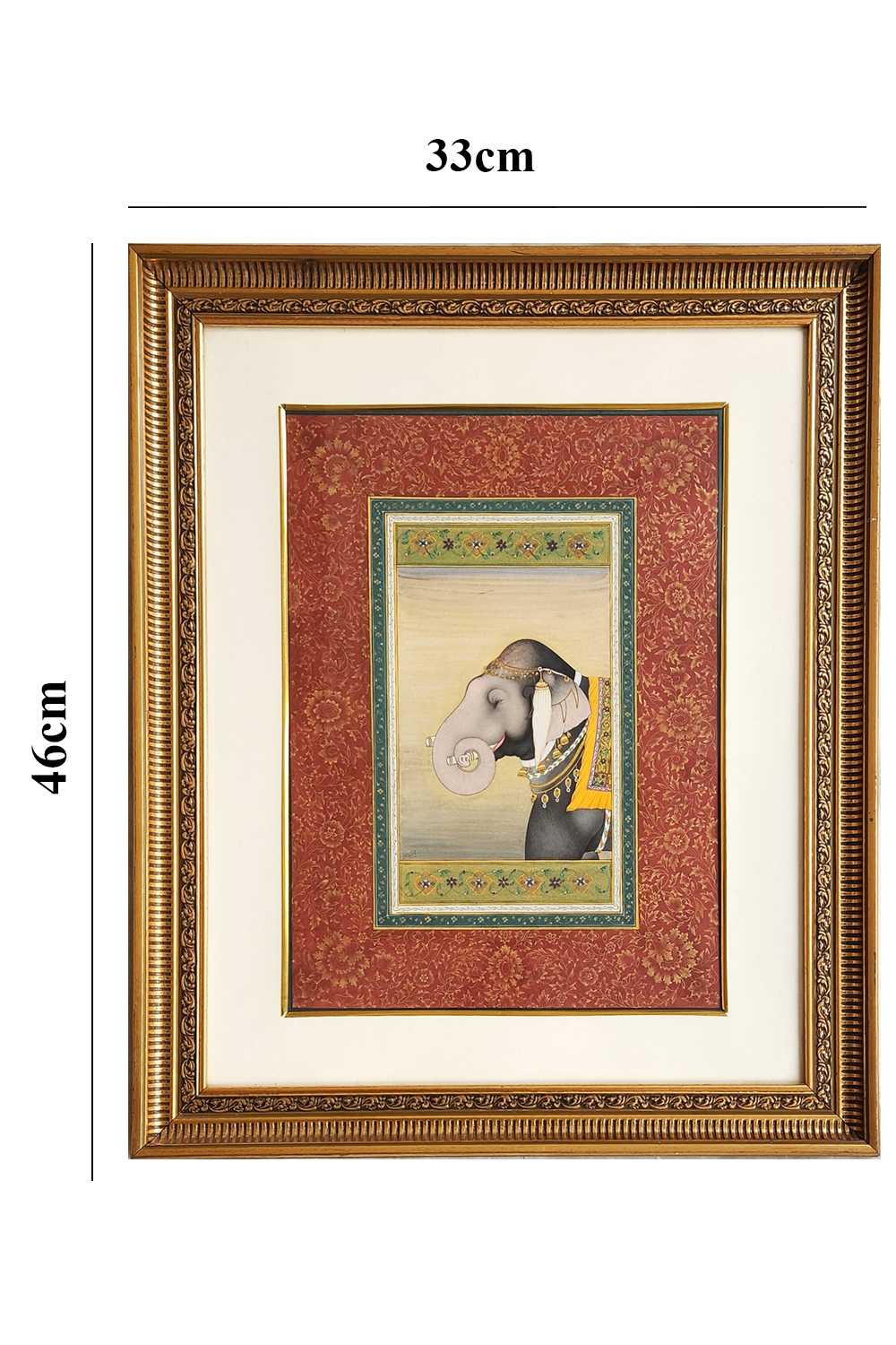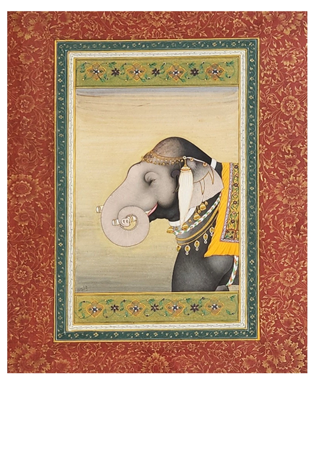 This exquisite miniature painting depicts a regal elephant adorned in traditional attire, showcasing the rich cultural heritage and artistic finesse of the region. The painting is characterized by: