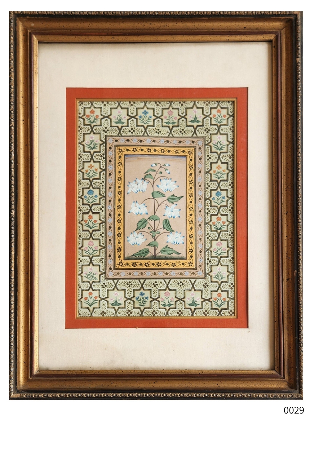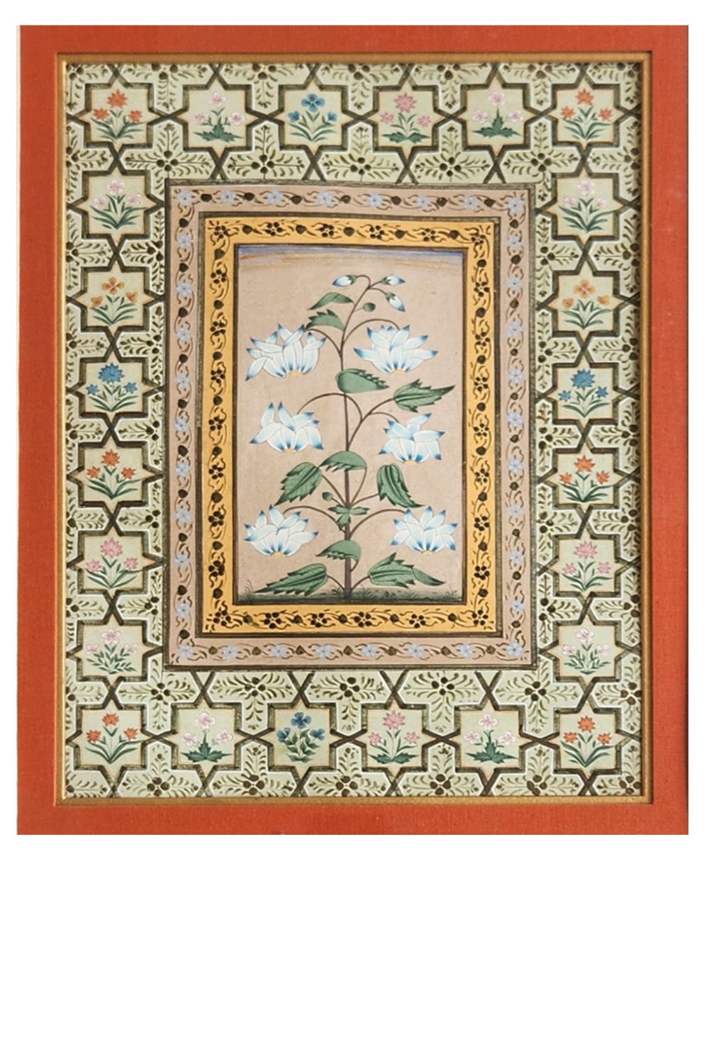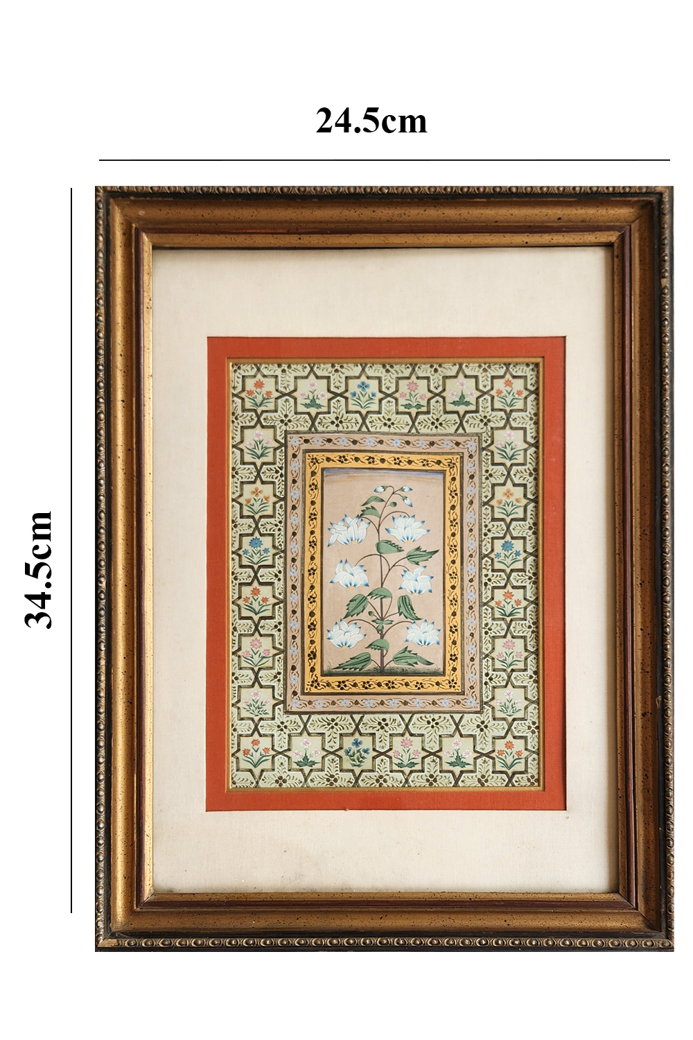 This exquisite miniature painting showcases the elegance of Mughal artistry, characterized by its detailed floral design and ornate borders. The central motif is a delicate plant with white flowers and green leaves, meticulously painted to capture the natural beauty. Surrounding the central image is a series of intricate geometric patterns, featuring a combination of floral and star-like designs in soft pastel colors. The painting is framed by a golden border with black floral accents, adding a touch of opulence. The outermost border is a rich red, providing a striking contrast to the intricate inner patterns. The entire composition is encased in a classic wooden frame with a golden finish.