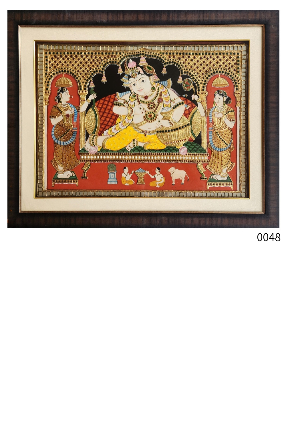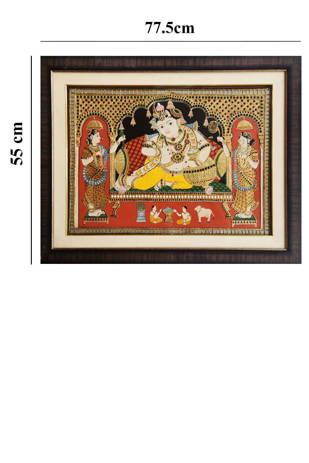 This exquisite Tanjore painting showcases Lord Krishna seated majestically in a royal court, exuding divine grace and opulence. The painting is characterized by: