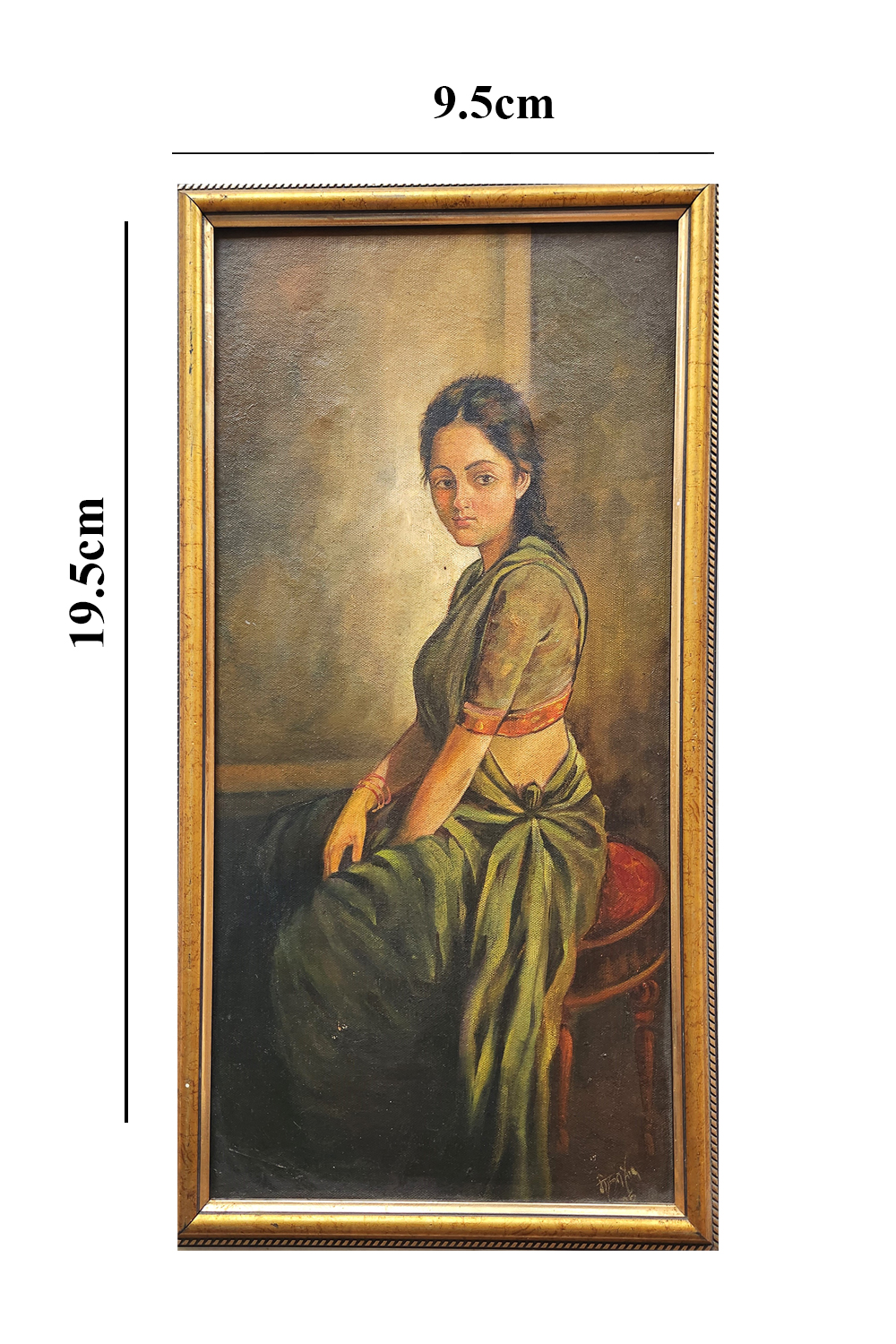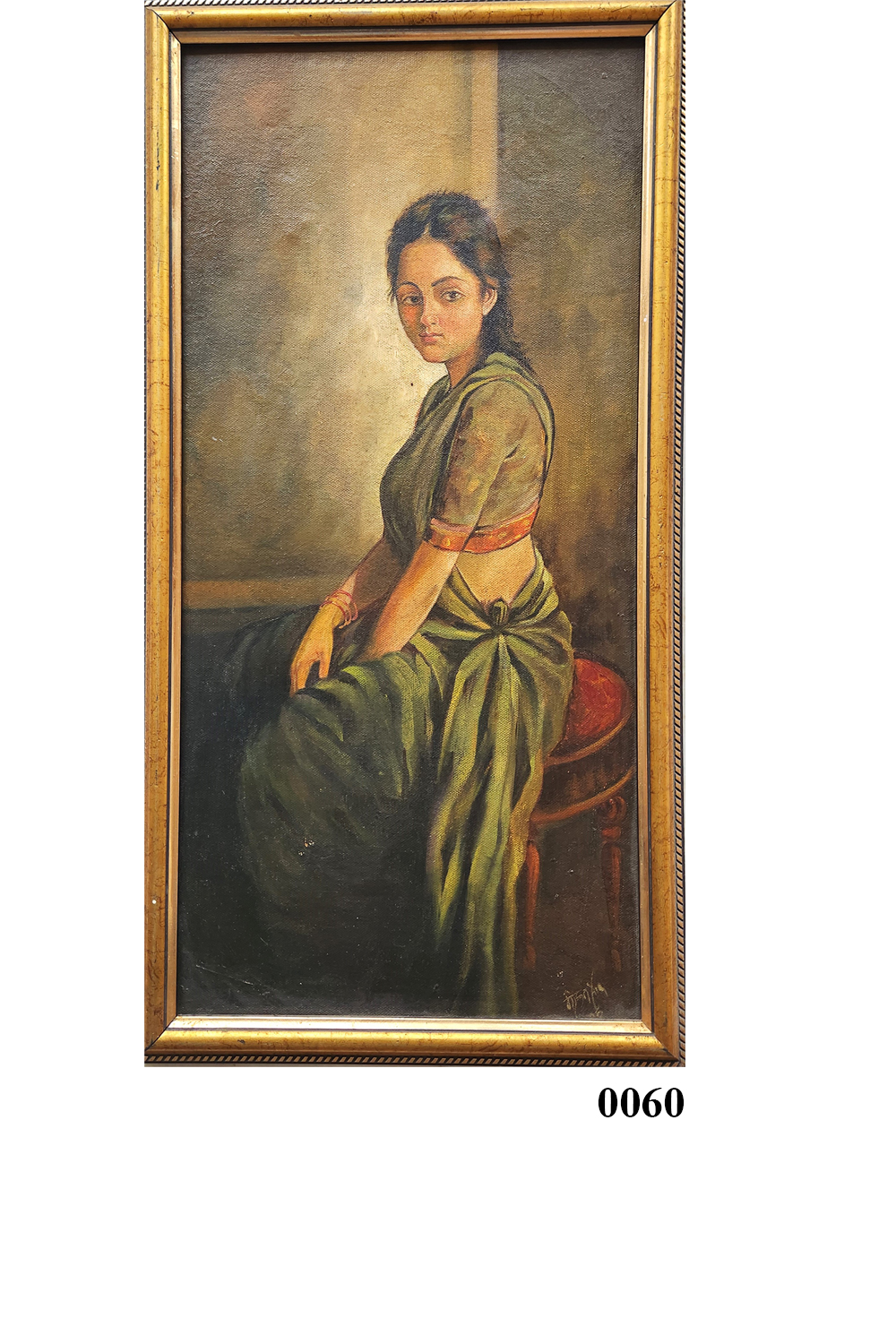 This oil painting, titled "Serene Reflection," portrays a woman seated on a stool, dressed in traditional attire. The painting is characterized by its warm, earthy tones and the soft interplay of light and shadow, which adds depth and dimension to the scene. The woman's attire, a green sari with a blouse, is depicted with intricate detailing, highlighting the texture and folds of the fabric. The background is kept minimalistic, focusing the viewer's attention on the subject. The painting exudes a sense of calm and introspection, inviting the viewer to ponder the thoughts of the woman. Key features include: