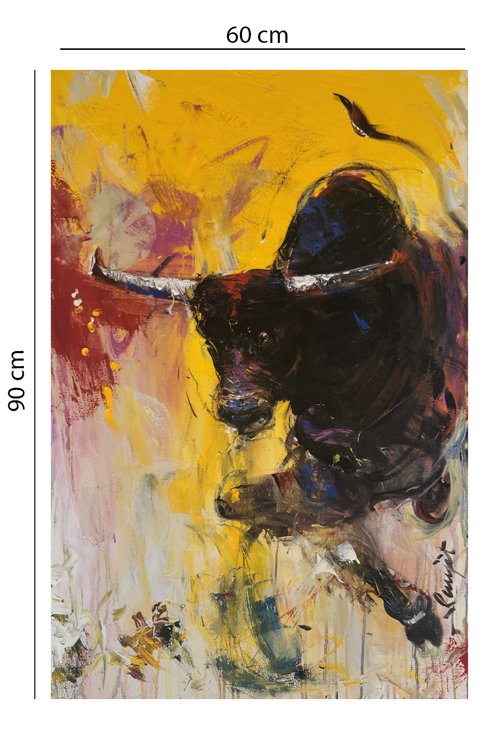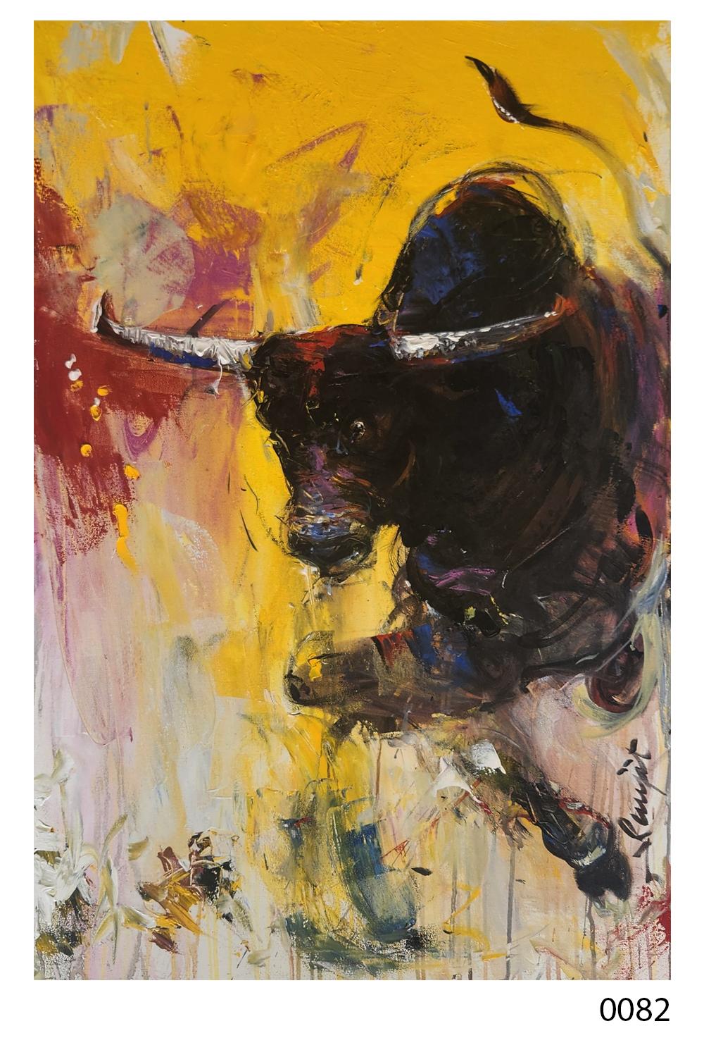 This striking oil painting, titled "Charging Bull," captures the raw energy and power of a bull in mid-charge. The artist employs a vivid palette dominated by yellows, reds, and dark hues to create a sense of movement and intensity. Key features include: