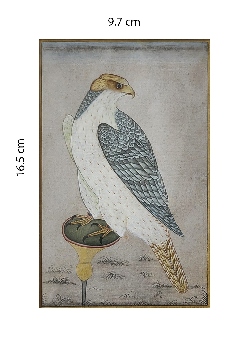 This exquisite miniature painting features a regal falcon perched on a stand, rendered with meticulous detail and precision. The falcon's plumage is depicted with fine brushwork, highlighting the intricate patterns and textures of its feathers. The bird's posture exudes a sense of majesty and calm, with its head turned slightly to the side. The background is minimalistic, allowing the viewer to focus on the falcon's striking presence. The painting is framed in a simple yet elegant wooden frame with a gold inner border, enhancing its overall aesthetic appeal. Key features include: