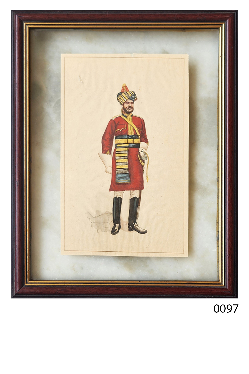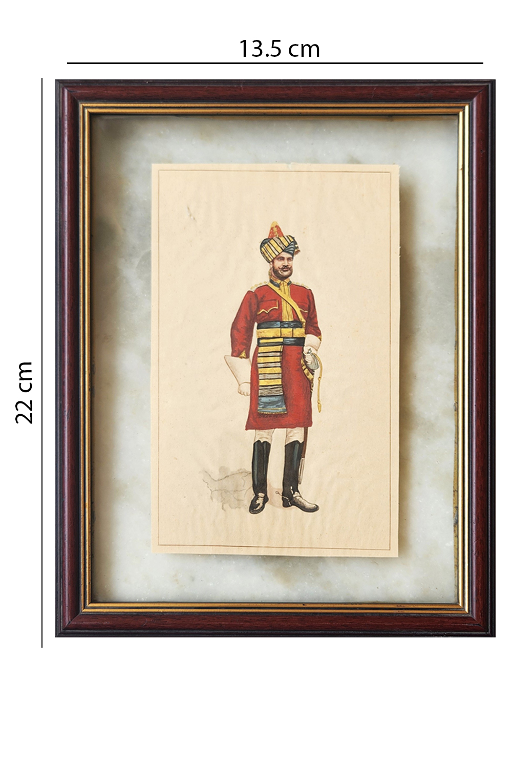 This miniature painting showcases a regal guard dressed in traditional ceremonial attire, characterized by vibrant colors and intricate details. The guard is adorned in a red tunic with gold and blue accents, a matching hat, and black boots. The painting captures the elegance and formality of the attire, highlighting the following features: