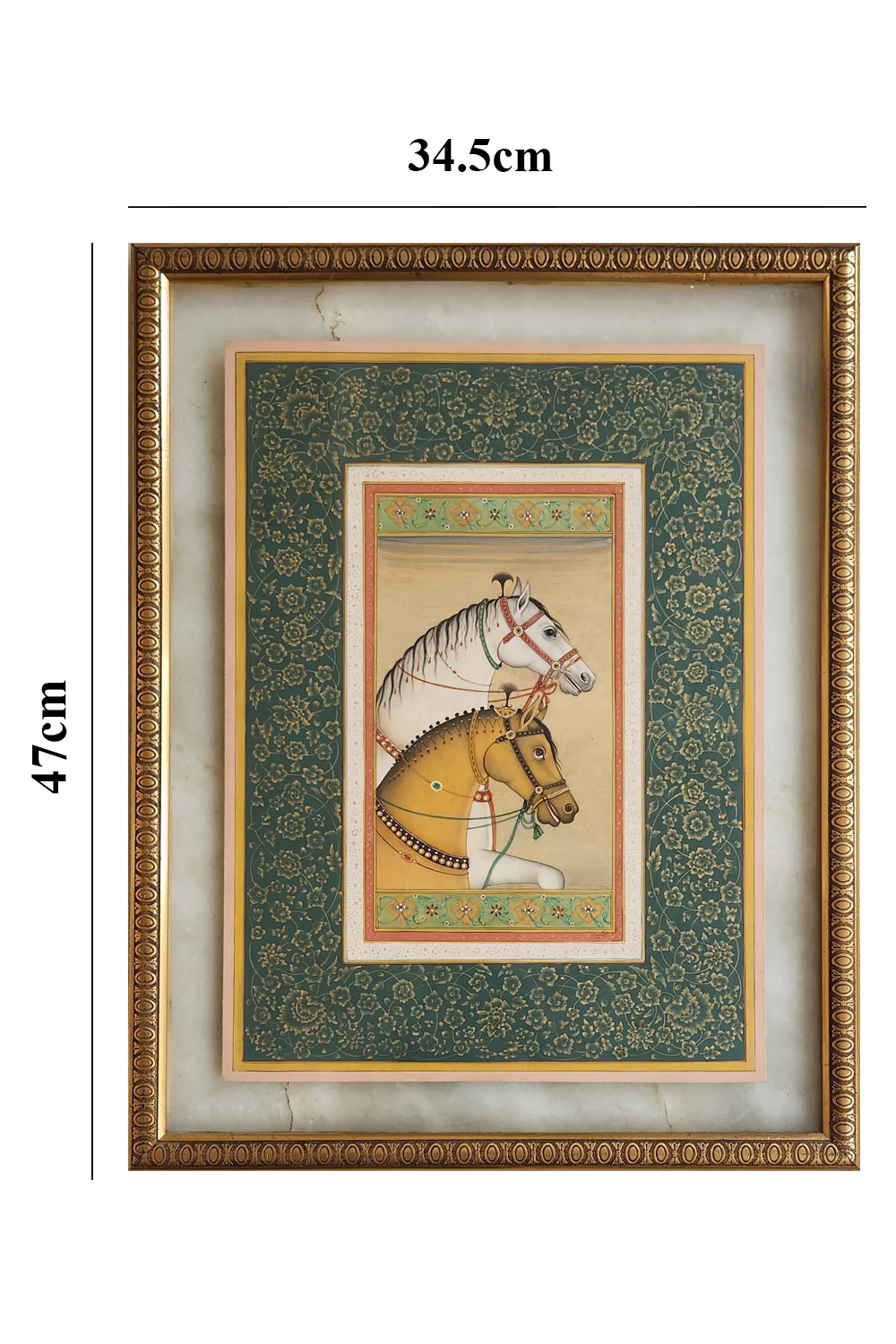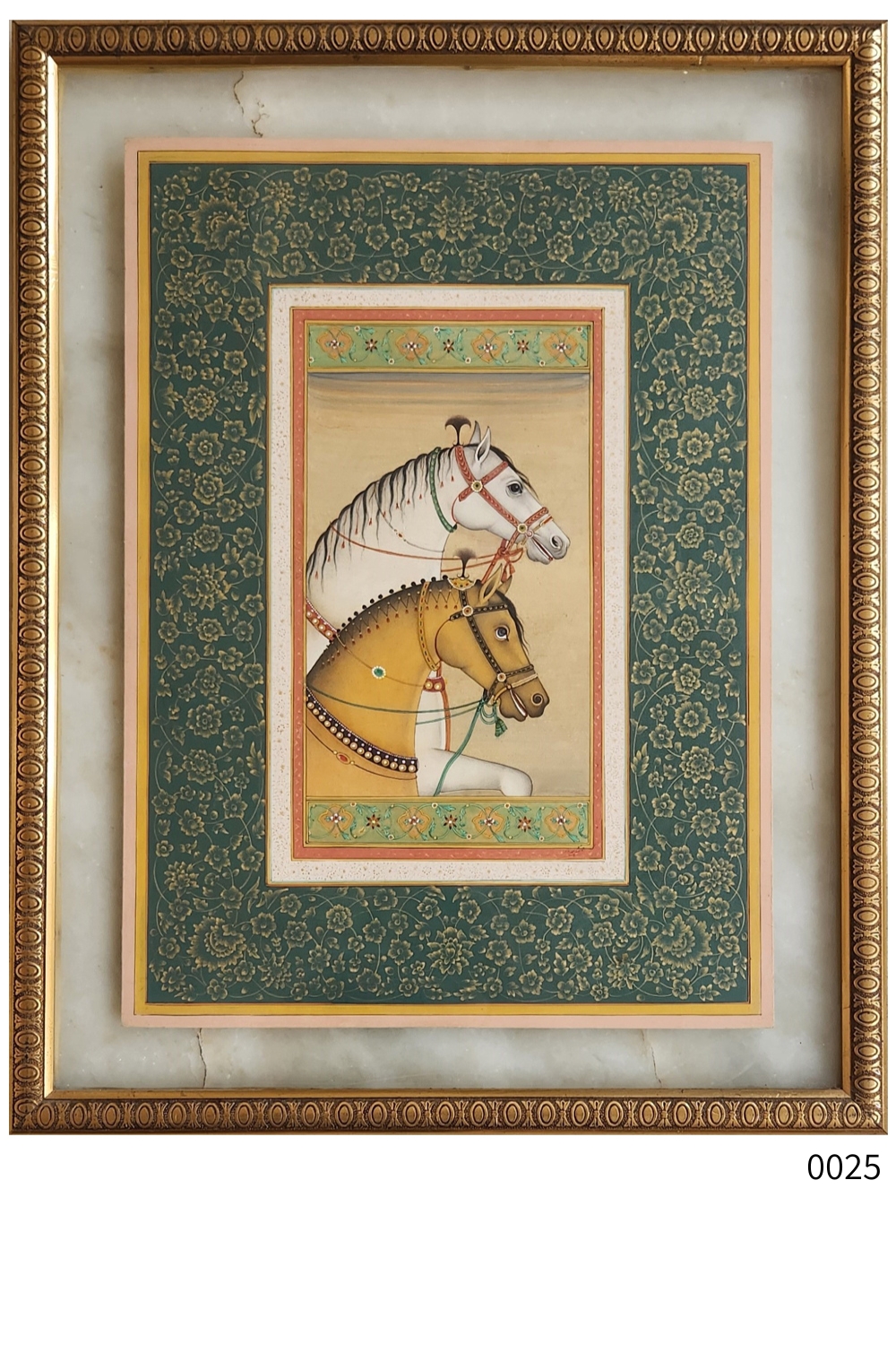 This exquisite miniature painting showcases two horses, one white and one brown, adorned with intricate bridles and harnesses, reflecting the regal aesthetics of Mughal art. The painting is framed with a detailed floral border in green and gold, enhancing its elegance. The horses are depicted with meticulous attention to detail, highlighting their majestic presence. The background features a subtle gradient, adding depth to the composition. The frame itself is ornate, with a golden pattern that complements the artwork. This piece exemplifies the rich tradition of Mughal miniature painting, known for its precision and decorative elements.