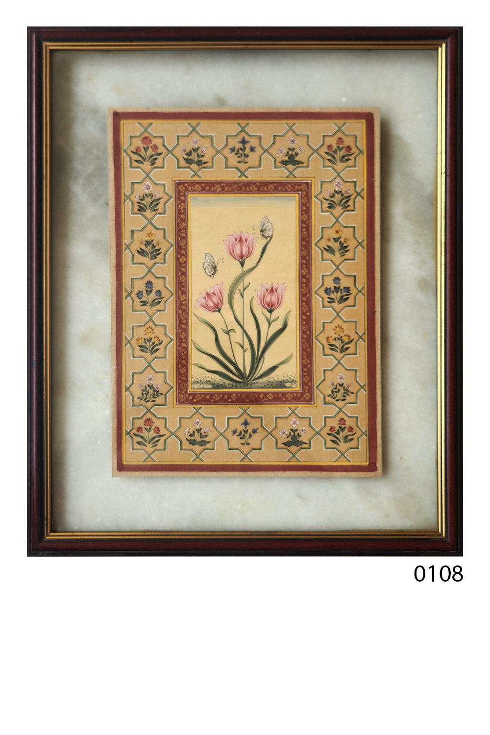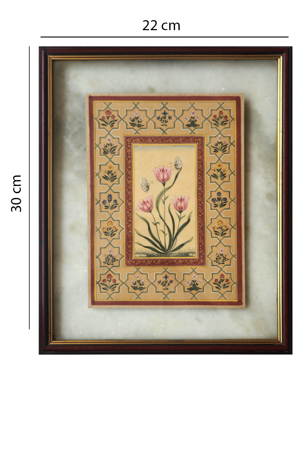 This exquisite miniature painting showcases a central composition of three pink tulips in full bloom, accompanied by two butterflies. The artwork is surrounded by a detailed border featuring various floral motifs in a geometric pattern. The colors are vibrant yet harmonious, with a predominant use of pinks, greens, and golds. The painting is framed in a dark wooden frame with a gold inner lining, adding a touch of elegance and sophistication. The intricate details and the delicate brushwork highlight the artist's skill and attention to detail.