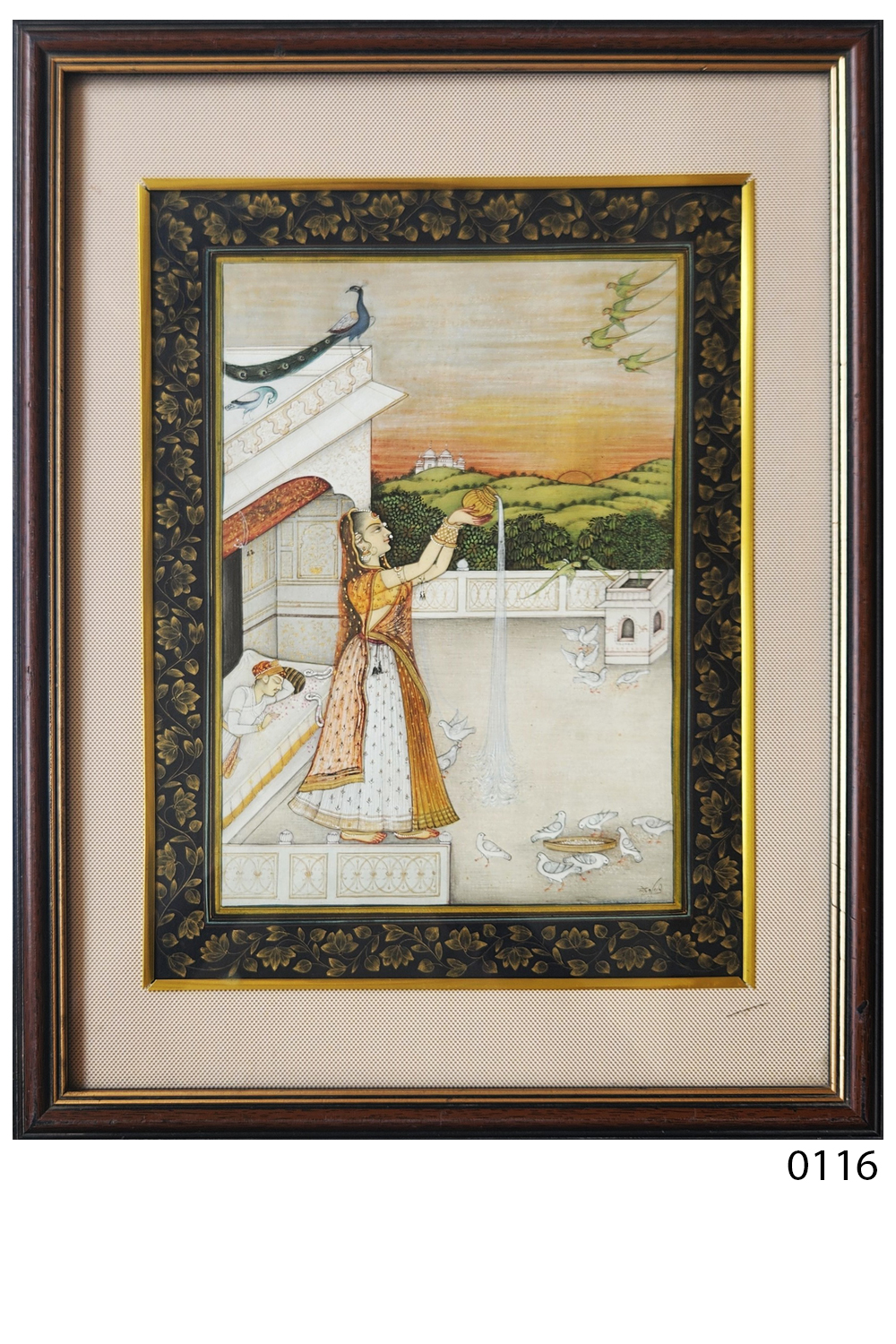 This exquisite miniature painting captures a tranquil morning scene on a terrace, featuring: