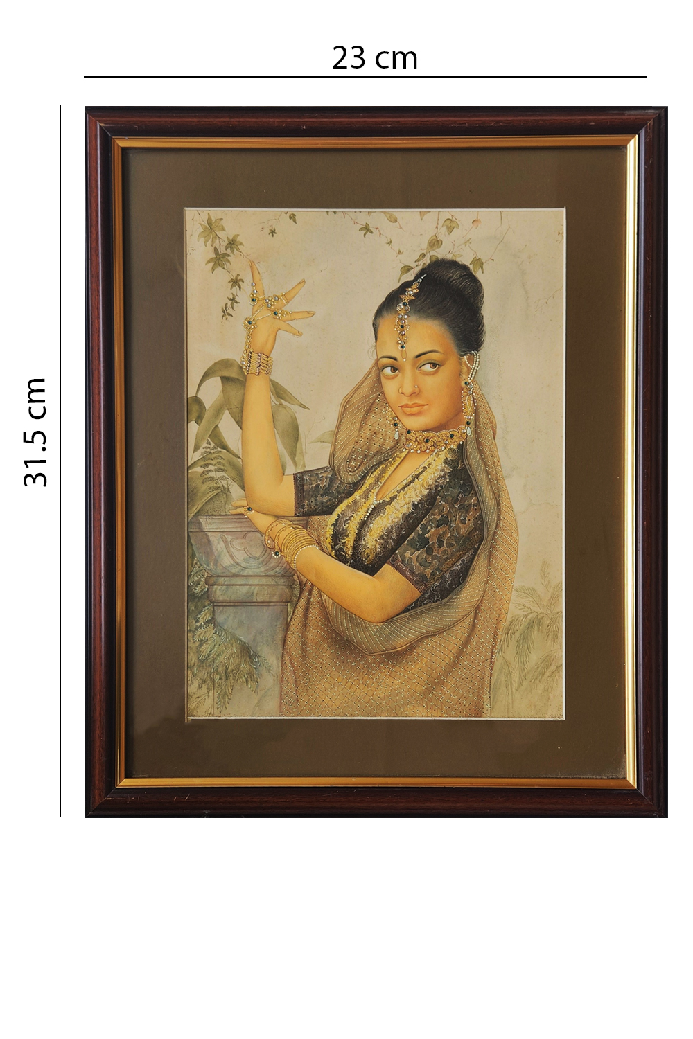 This painting depicts a traditional Indian woman in a graceful and elegant pose, showcasing the rich cultural heritage of India. The woman is adorned with intricate jewelry, including bangles, rings, and a headpiece, which highlights the detailed craftsmanship. She is dressed in a beautifully embroidered saree with a matching blouse, adding to the overall elegance of the artwork. The background features subtle botanical elements, enhancing the serene and natural ambiance of the painting. The use of soft colors and delicate brushstrokes further accentuates the grace and poise of the subject.
