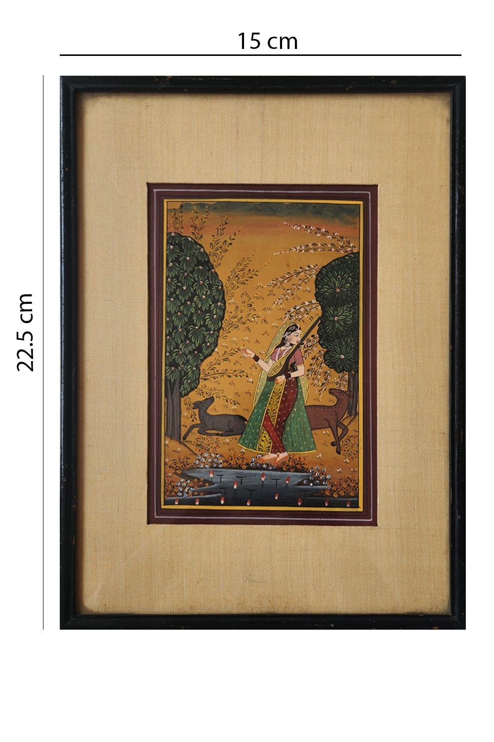 This exquisite miniature painting captures the essence of classical Indian art, showcasing a lady adorned in traditional attire playing a veena. The background features a lush forest with two deer, adding to the tranquil ambiance. The painting is rich in detail and color, with the following notable features: