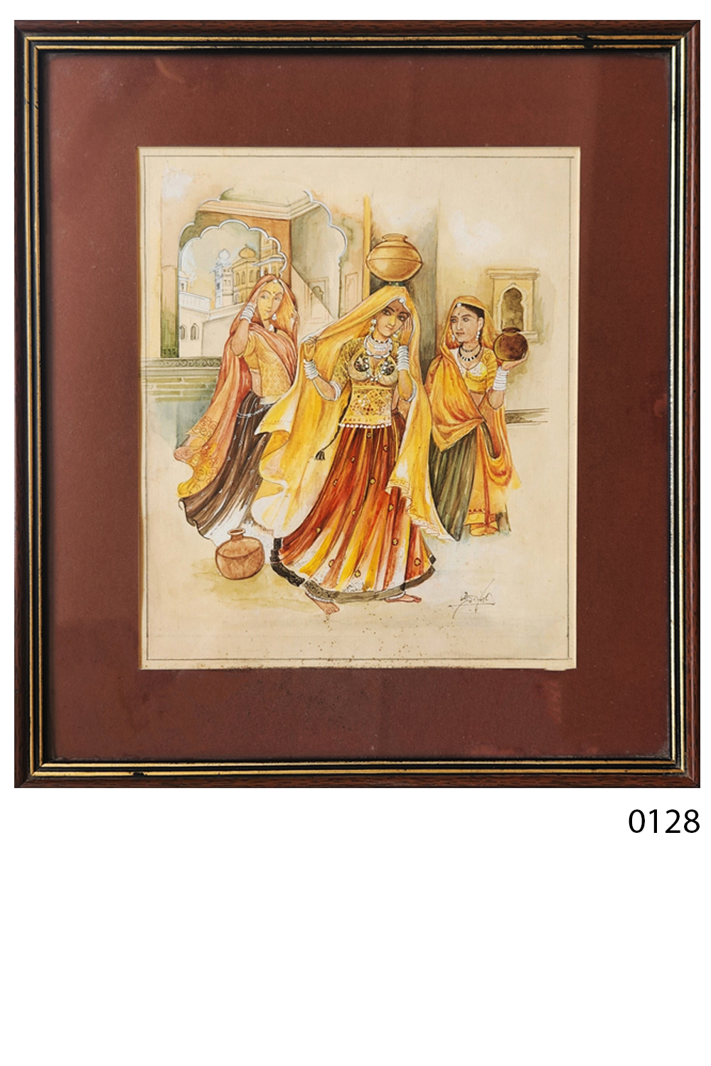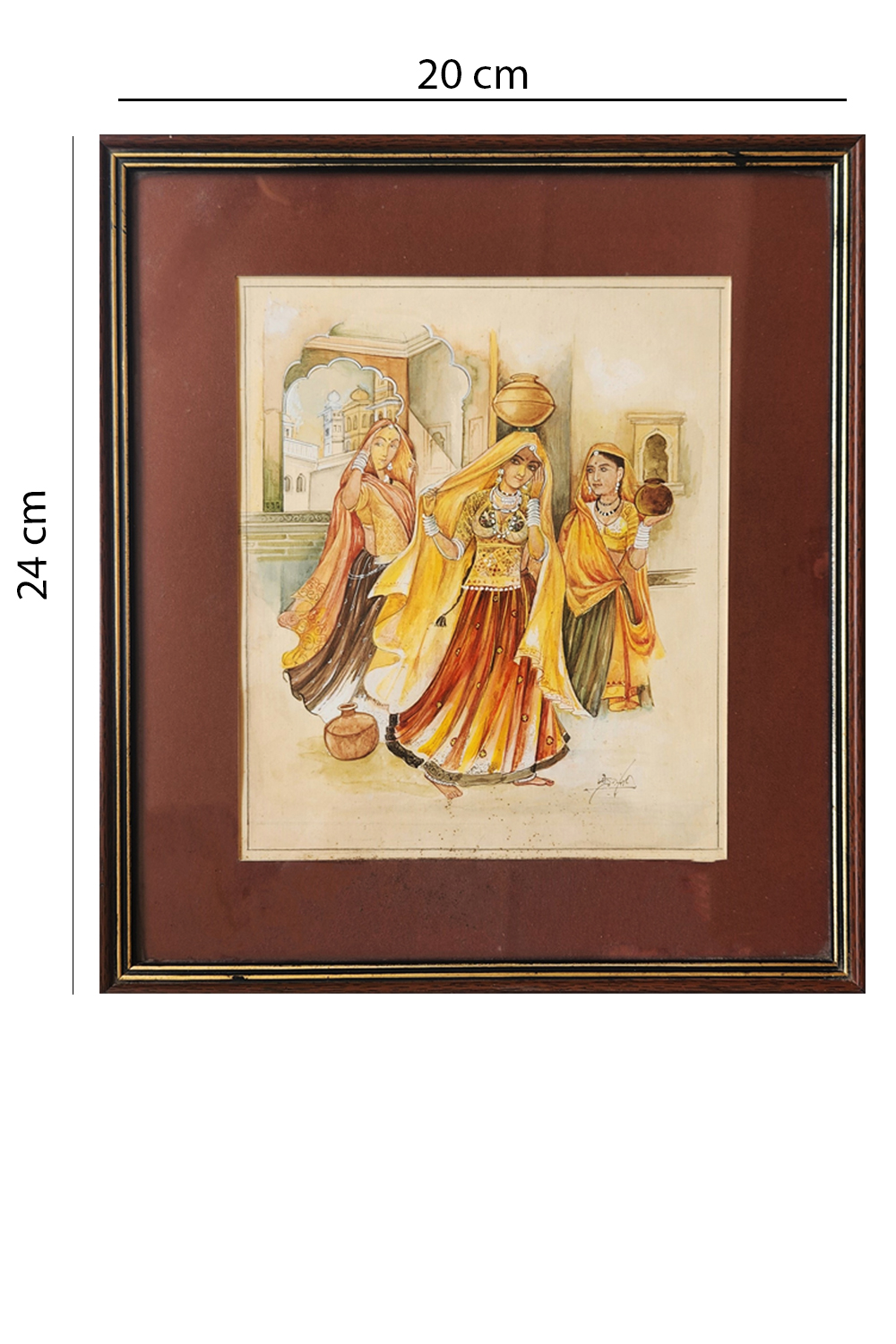 This exquisite miniature painting captures the essence of Rajasthani culture through the depiction of three women dressed in traditional attire. The painting is rich in detail and color, showcasing: