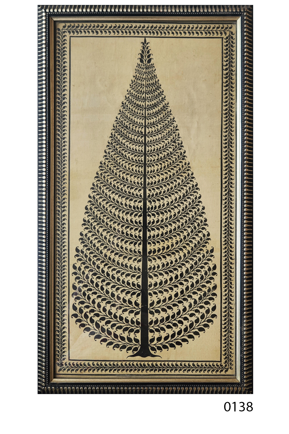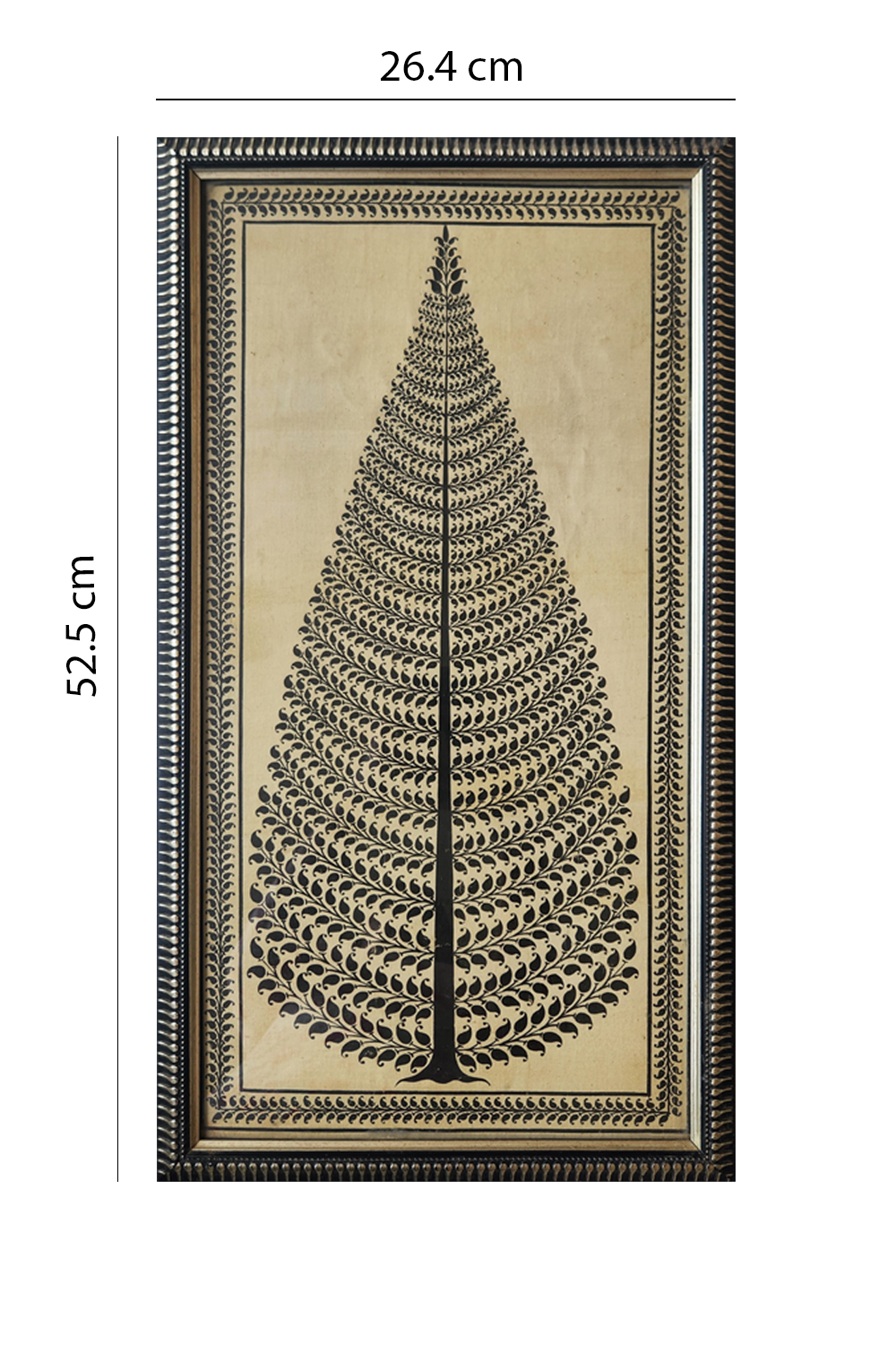 This artwork, titled "Symmetry of Nature," showcases a beautifully symmetrical tree rendered in black ink on a beige background. The tree is composed of a series of meticulously arranged leaf patterns that create a visually striking and harmonious design. The features of this painting include: