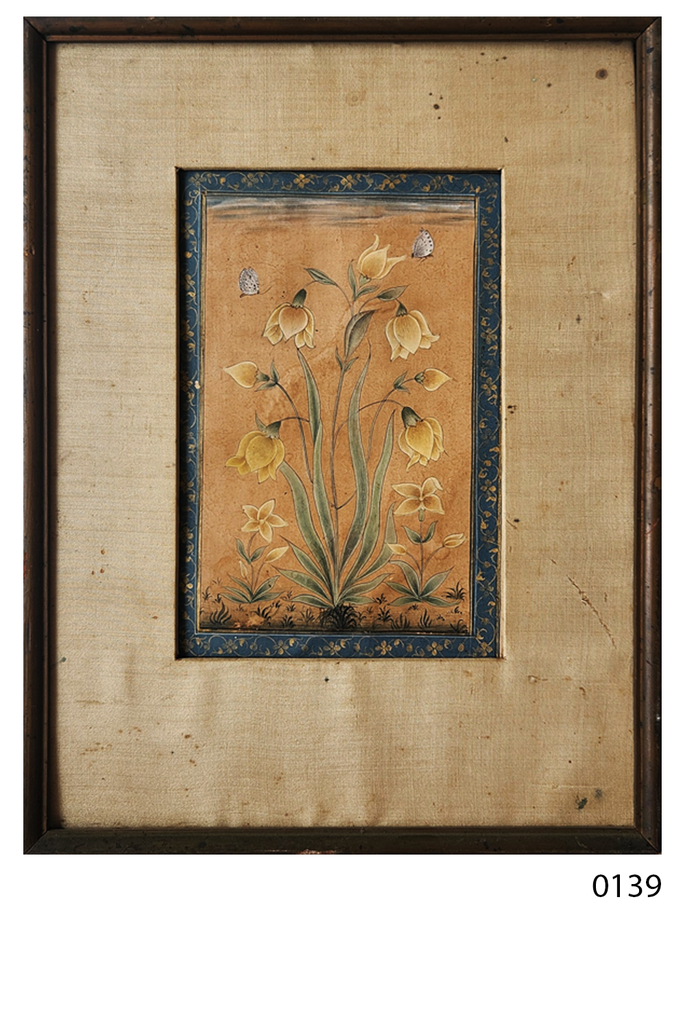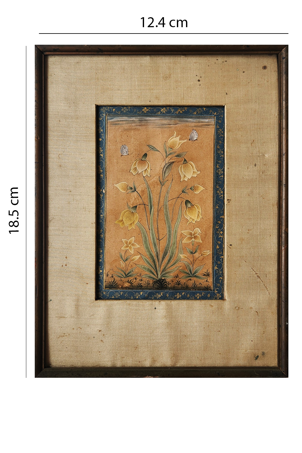 This exquisite miniature painting showcases a cluster of yellow bell flowers, elegantly arranged with slender green leaves. Two butterflies are delicately perched on the flowers, adding a touch of liveliness to the composition. The painting is bordered by a detailed blue frame adorned with golden floral patterns, enhancing its visual appeal. The background is a warm, earthy tone that complements the colors of the flowers and butterflies. The painting is mounted on a textured beige fabric, which adds to its antique charm.