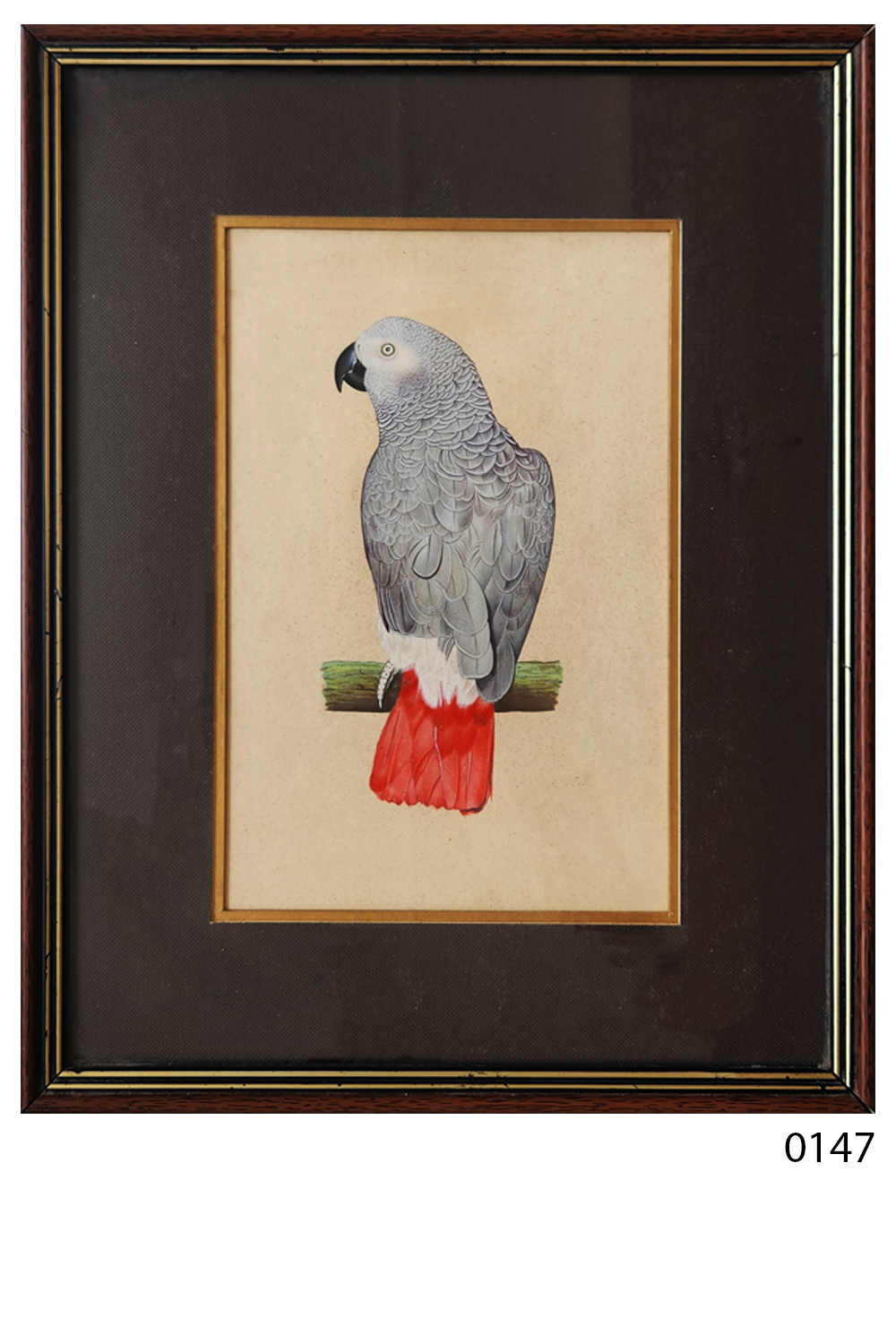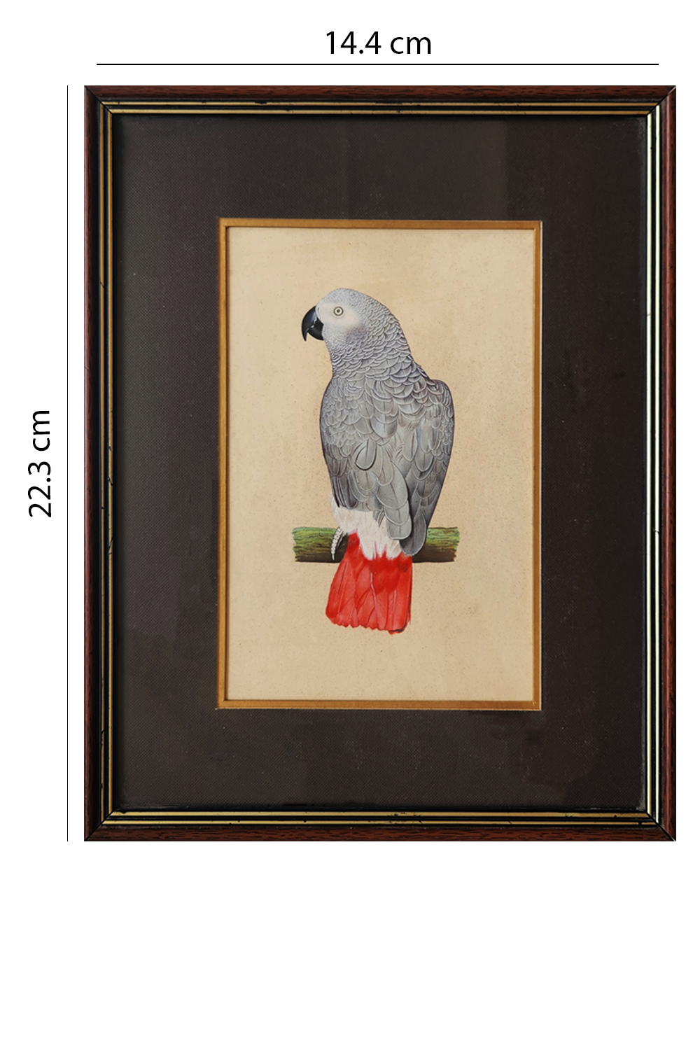 This exquisite miniature painting captures the elegance of the African Grey Parrot, known for its intelligence and striking appearance. The painting features: