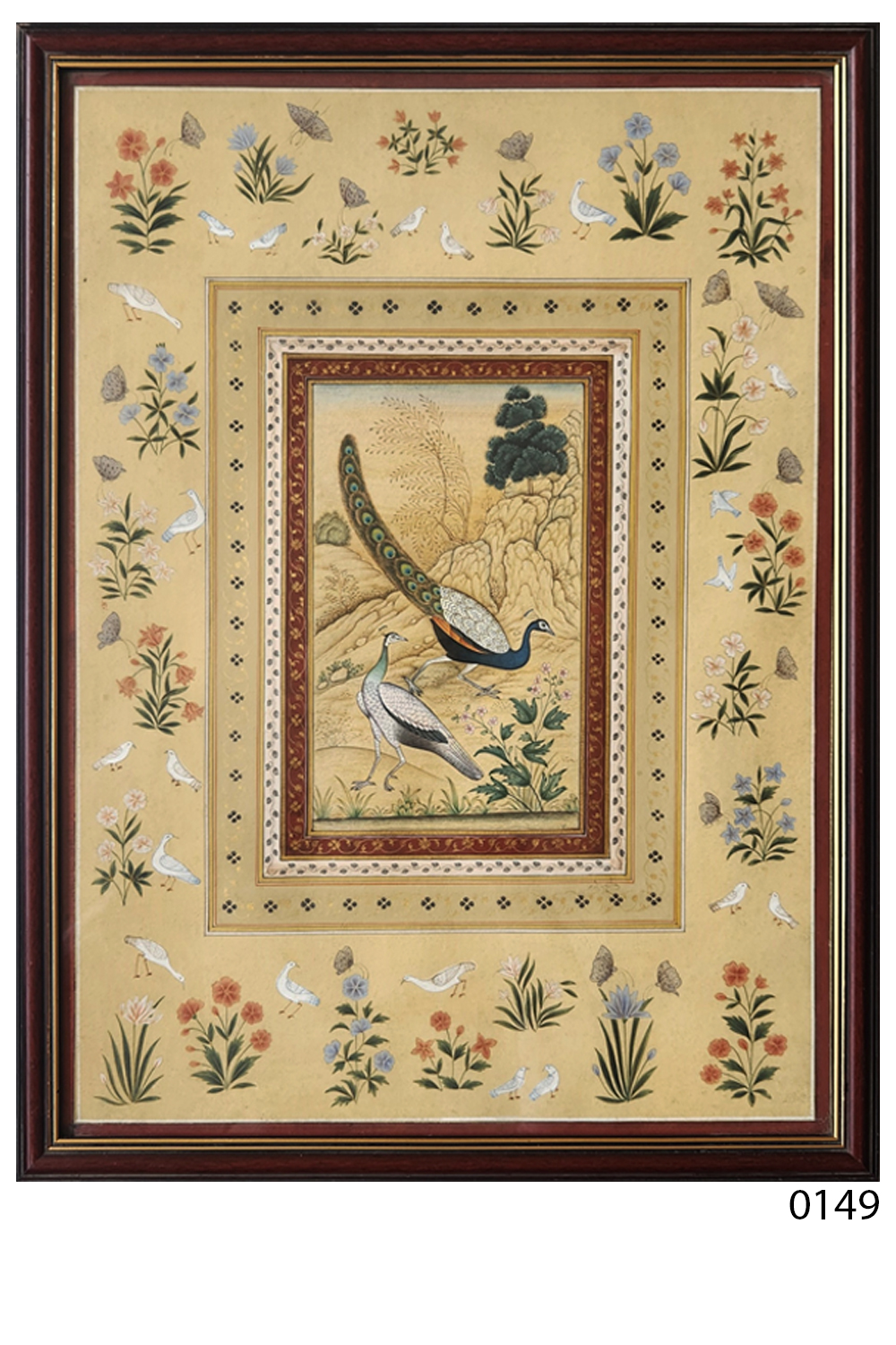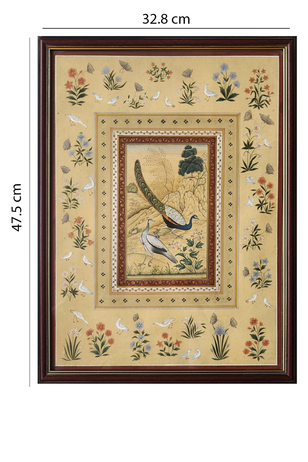 This exquisite miniature painting showcases two peacocks, one with its feathers fully displayed, set against a backdrop of rocky terrain and a tree. The painting is surrounded by a detailed border featuring various flowers and birds, adding to its intricate beauty. Key features include: