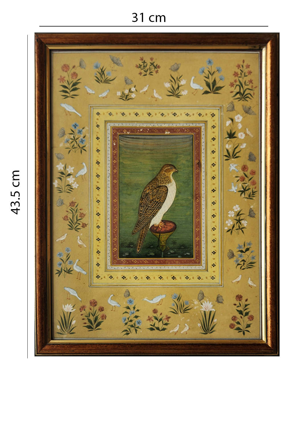 This exquisite miniature painting showcases a falcon perched gracefully on a stand, set against a green backdrop. The painting is framed by multiple borders, each adorned with intricate patterns. Surrounding the central image are beautifully detailed floral and avian motifs, featuring various birds and flowers in vibrant colors. The artwork is enclosed in a wooden frame, enhancing its elegance. Key features include: