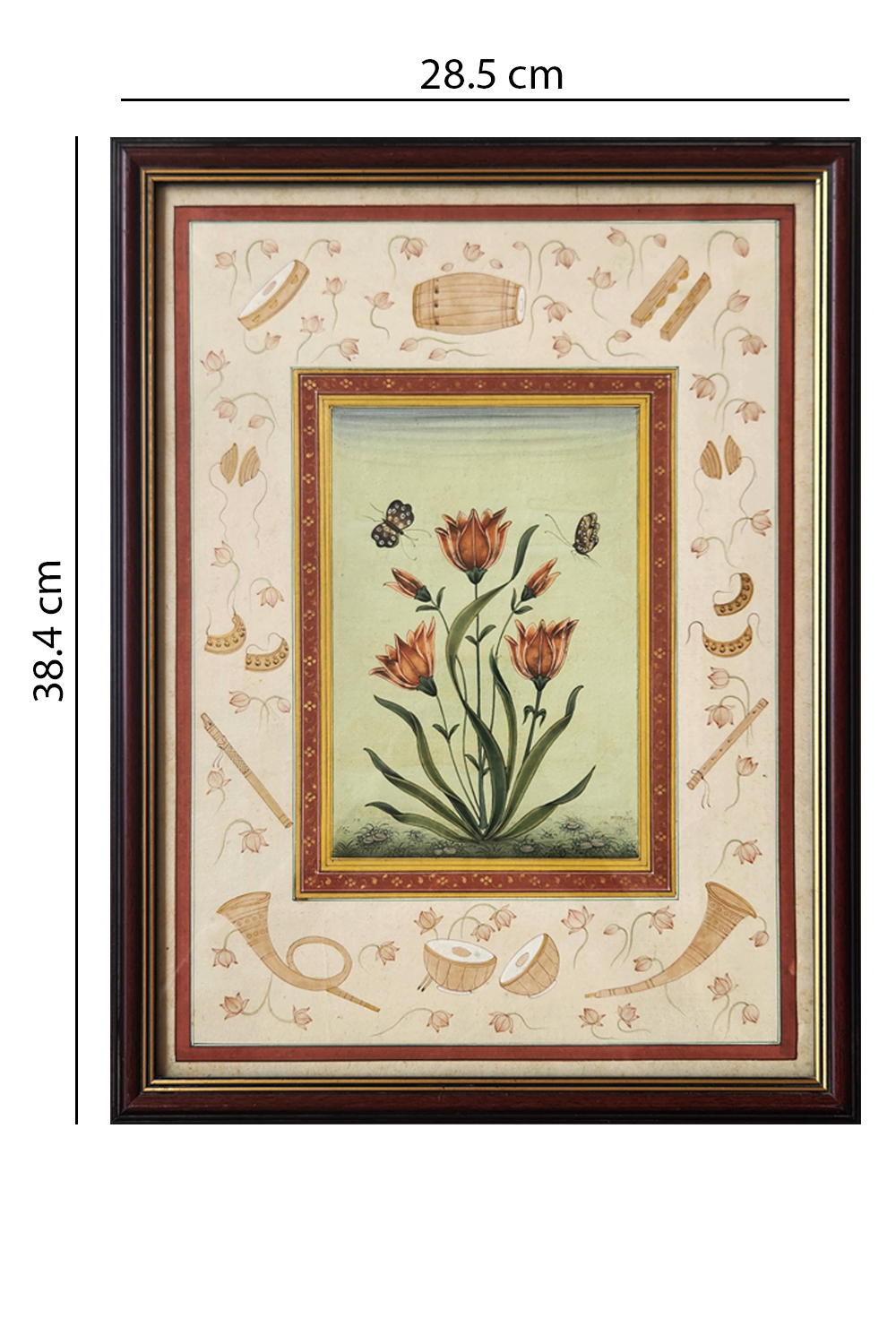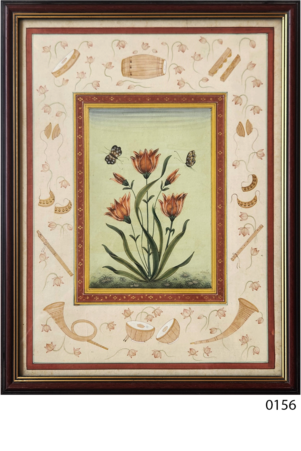 This exquisite miniature painting showcases a central composition of blooming orange flowers with green leaves, accompanied by two butterflies. The artwork is framed with a decorative border that includes various musical instruments and floral patterns. The painting is characterized by: