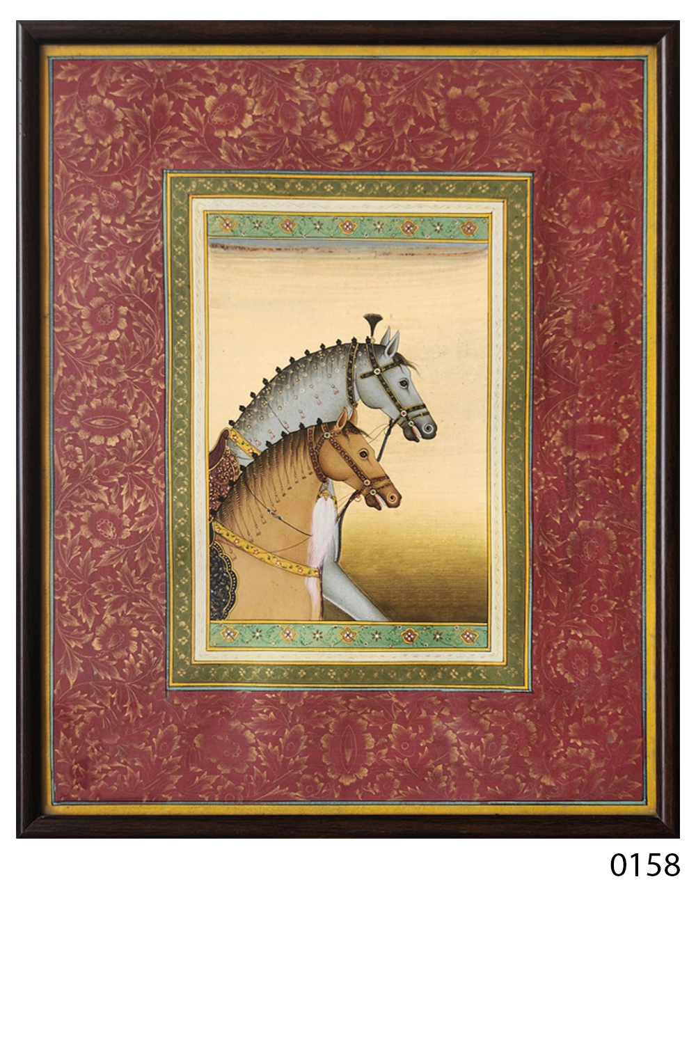 This exquisite miniature painting showcases two horses, one white and one brown, adorned with intricate bridles and saddles, reflecting the grandeur of Mughal art. The painting is framed with a rich, floral-patterned border in shades of red and green, enhancing its regal appearance. The horses are depicted with meticulous attention to detail, highlighting their majestic posture and the ornate decorations. The background features a golden hue, adding a touch of opulence to the overall composition. The painting is a fine example of traditional craftsmanship, capturing the elegance and nobility of the subjects.