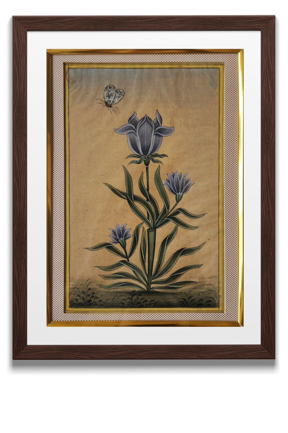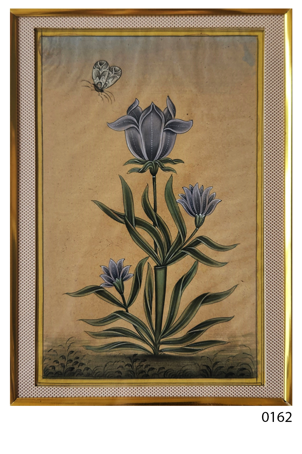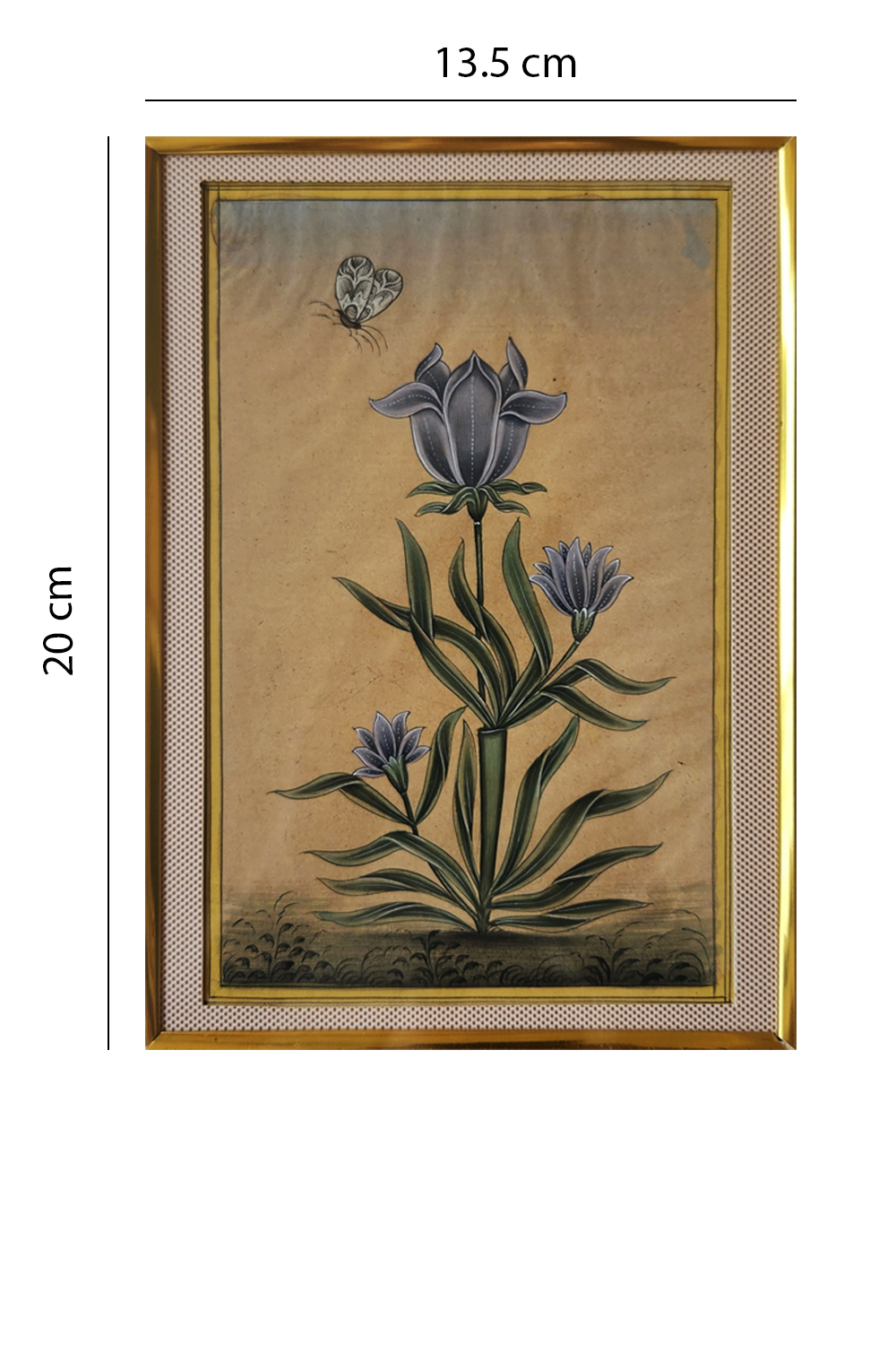This exquisite miniature painting captures the serene beauty of nature with a butterfly gracefully hovering above a cluster of blue flowers. The artwork is characterized by its intricate detailing and vibrant colors, set against a muted background that enhances the central elements. The painting features: