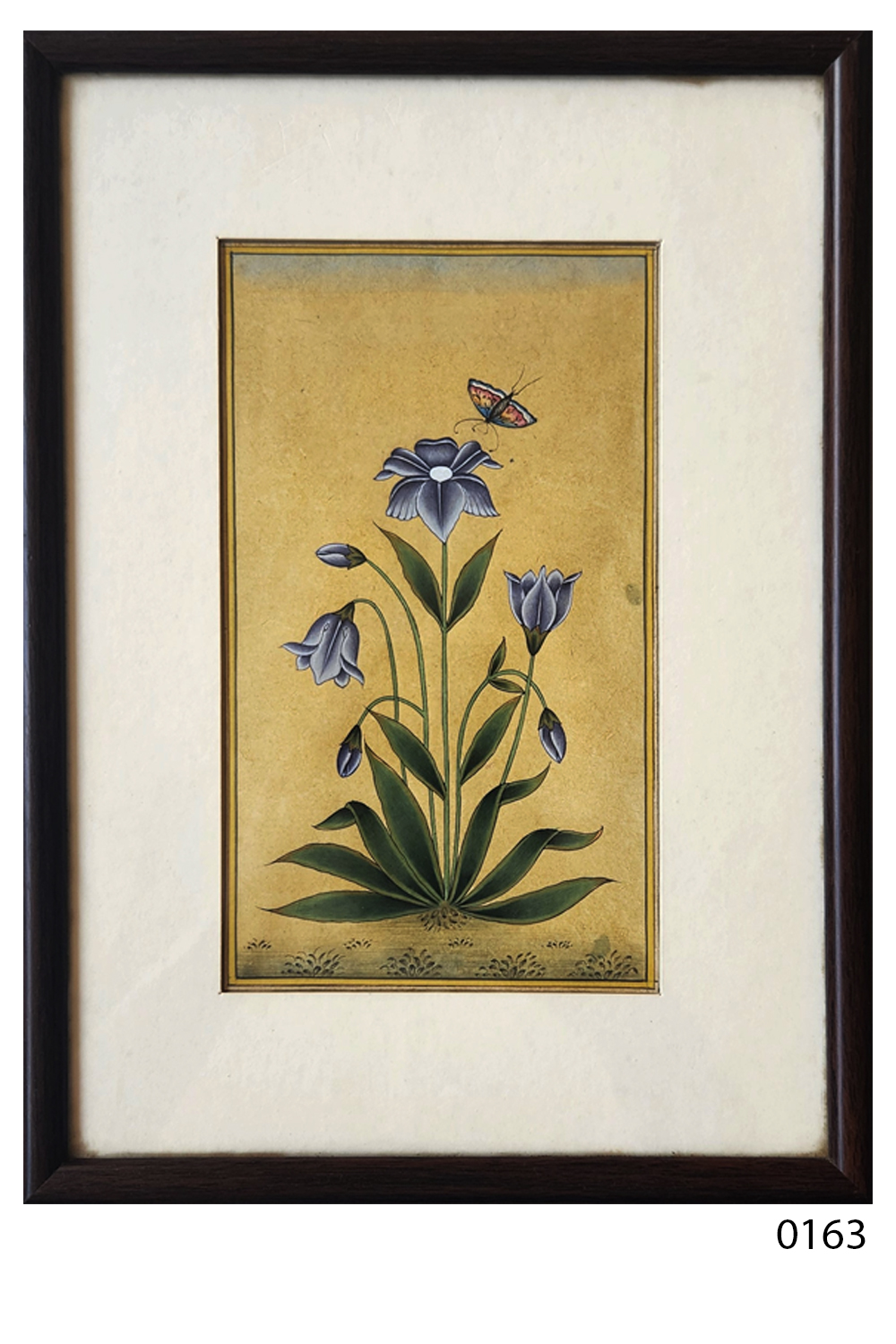 This exquisite miniature painting captures the serene beauty of nature with a butterfly gracefully hovering above a cluster of blue flowers. The artwork is characterized by its intricate detailing and vibrant colors, set against a muted background that enhances the central elements. The painting features: