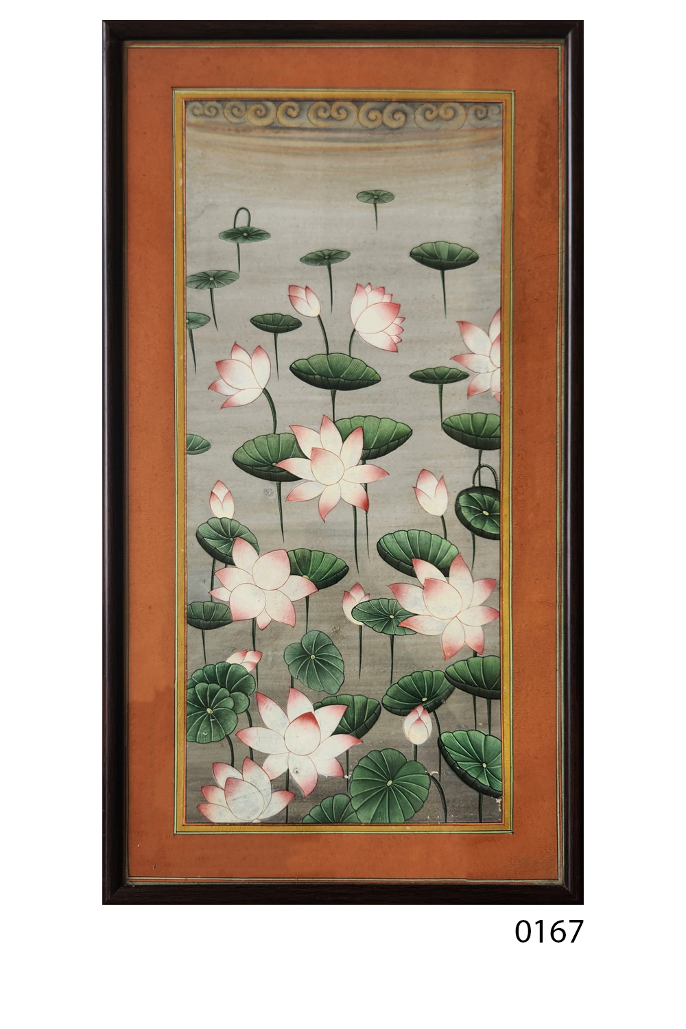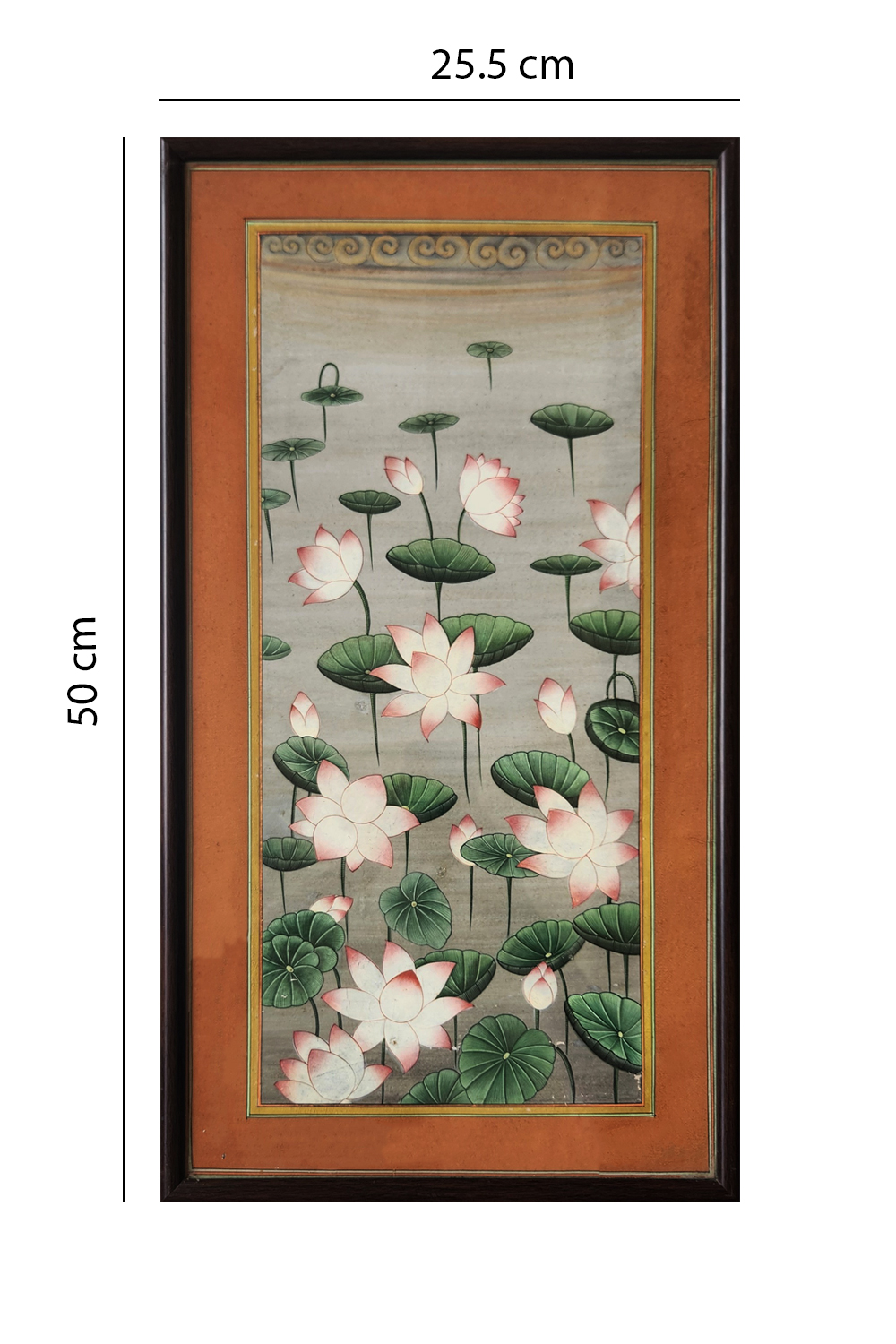 This exquisite miniature painting captures the serene beauty of a lotus pond, showcasing the elegance and tranquility of nature. The artwork features: