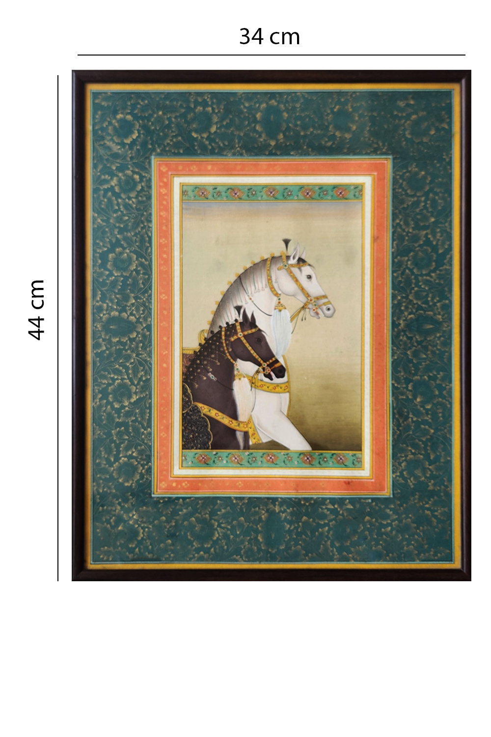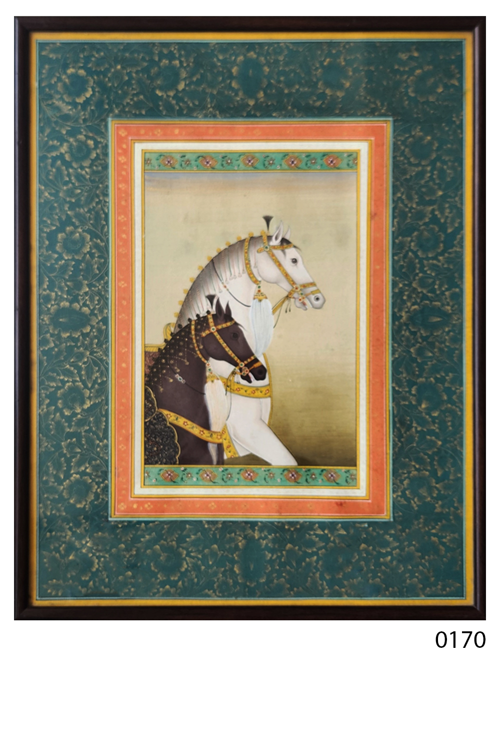 This exquisite miniature painting showcases two horses, one white and one dark brown, adorned with intricate and ornate bridles and harnesses, reflecting the grandeur of royal stables. The painting is framed with a richly decorated border featuring floral patterns and vibrant colors, enhancing its regal appearance. The horses are depicted with meticulous attention to detail, highlighting their majestic posture and the luxurious embellishments they wear. The background is kept minimal, ensuring the focus remains on the horses and their elaborate adornments.