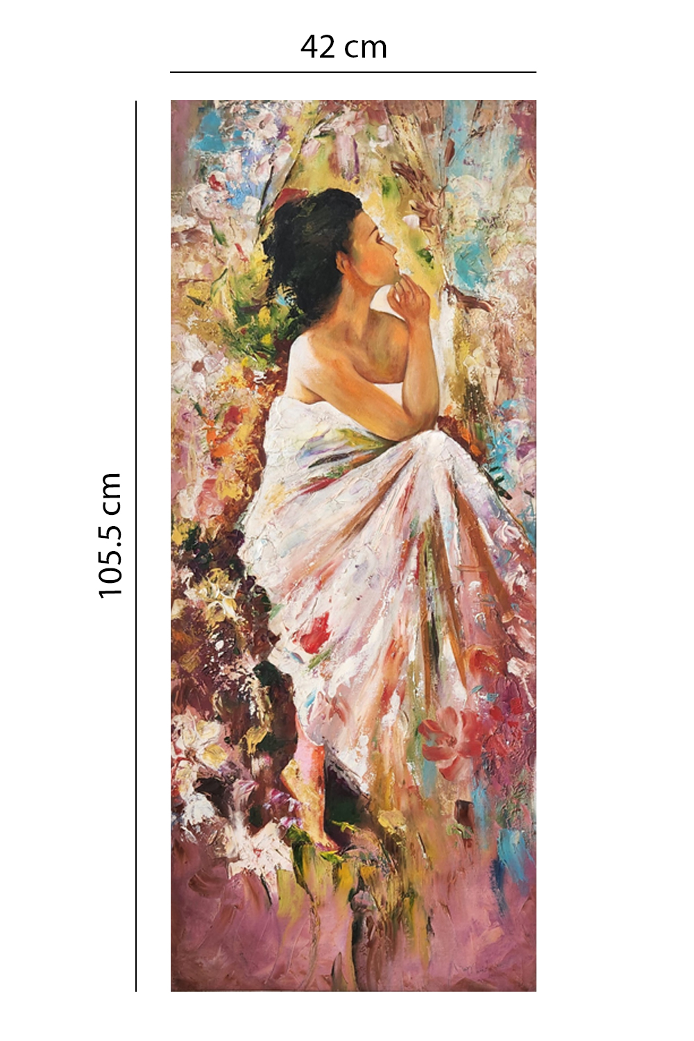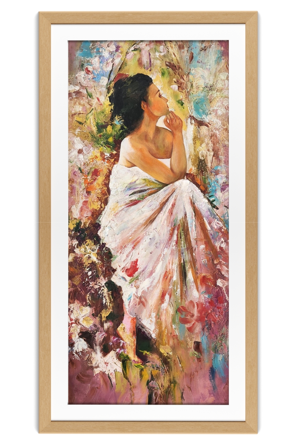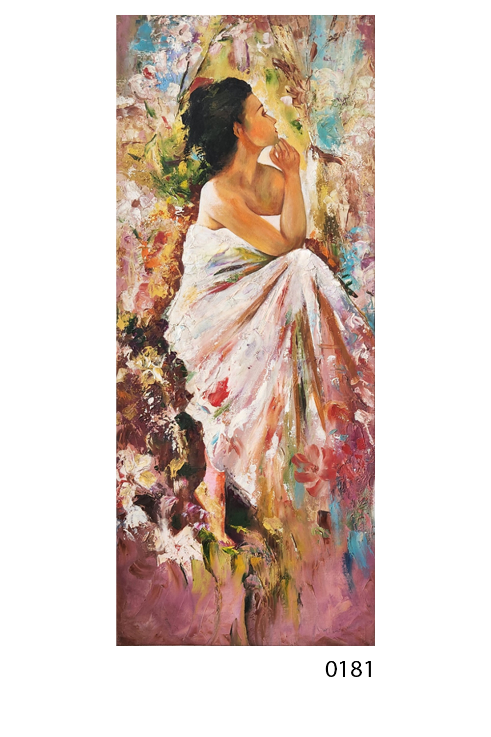 "Contemplation in Color" captures a serene moment of introspection. The figure, draped in a white cloth with hints of pink and red, sits gracefully amidst a whirlwind of colors and textures. The background blends abstract elements with splashes of blue, green, and earthy tones, creating a dynamic and lively atmosphere. The brushstrokes are bold and expressive, adding depth and movement to the composition. The figure’s pose, with one arm resting on the knee and the other hand near the face, suggests a moment of quiet reflection. The painting’s vertical orientation enhances the elegance and poise of the subject.